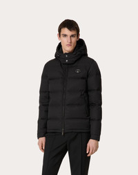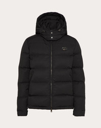 Valentino hooded down jacket in nylon with leather patch and VLogo Signature - Slim fit - Lined - Padded - Leather patch and VLogo Signature on chest - Zipper closure - Two side pockets - Composition: 64% Polyester, 36% Elastomultiester - Lining: 100% Polyester - Padding: 80% Down, 20% Feather - Length: 67 cm / 26.4 in. from the back of the neck in an Italian size 46 - The model is 187 cm / 6'1" tall and wears an Italian size 46 - Made in Italy The look of the model is completed by Valentino Garavani True Act Shoes. Product code: 5V3CNA31CKV_0NO
