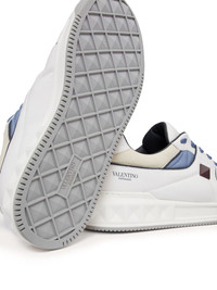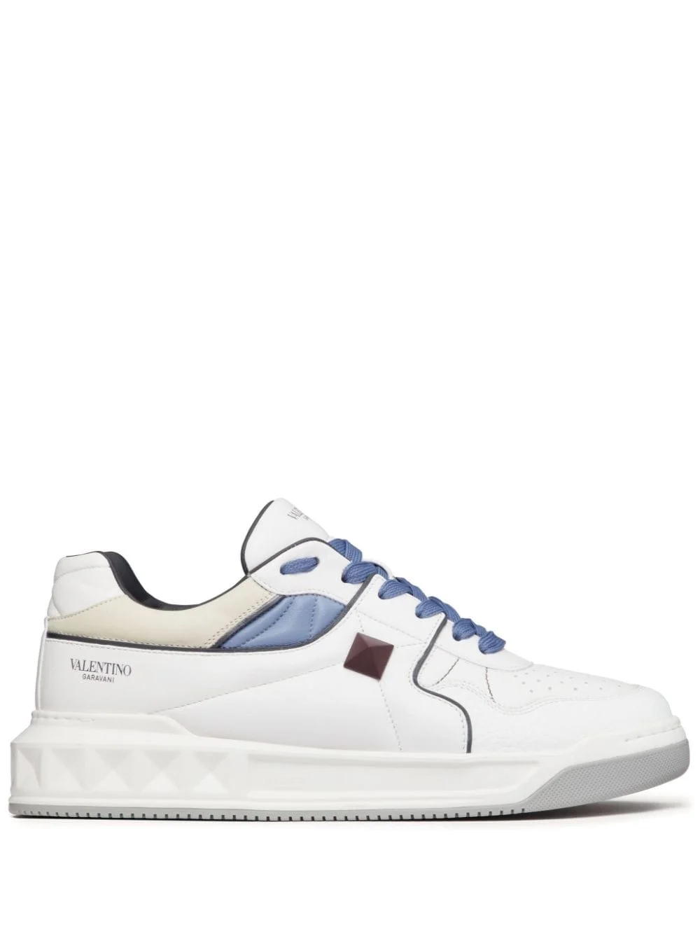 One Stud leather sneakers These Valentino Garavani sneakers are embossed with the signature Maxi Stud detail on the side, whilst the ubiquitous motif is debossed to the outsole, adding depth and dimension to the leather pair. Highlights - White/blue/grey - Lambskin - Logo print to the side - Maxi stud detailing - Perforated toebox - Round toe - Front lace-up fastening - Logo-print tongue - Branded insole - Rubber sole Made in Italy Composition Outer: Lambskin 100%, Calf Leather 100%, Polyester 100% Sole: Rubber 100% Lining: Polyester 100%, Bos Taurus 100% SIZE & FIT Measurement HEEL 1.96 in(5 cm) Sole height 1.18 in(3 cm) Washing instructions Read Manufacturer Guidelines