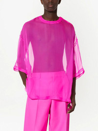 crew neck chiffon top This silk shirt from Valentino Garavani is presented in the house's latest signature colourway. The design was welcomed during the Pink PP collection and is instantly recognisable. Highlights - Valentino ready to wear - Fuchsia pink - Silk - Sheer - Crew neck - Short sleeves - Drop shoulder Made in Italy Composition Silk 100% Washing instructions Read Manufacturer Guidelines