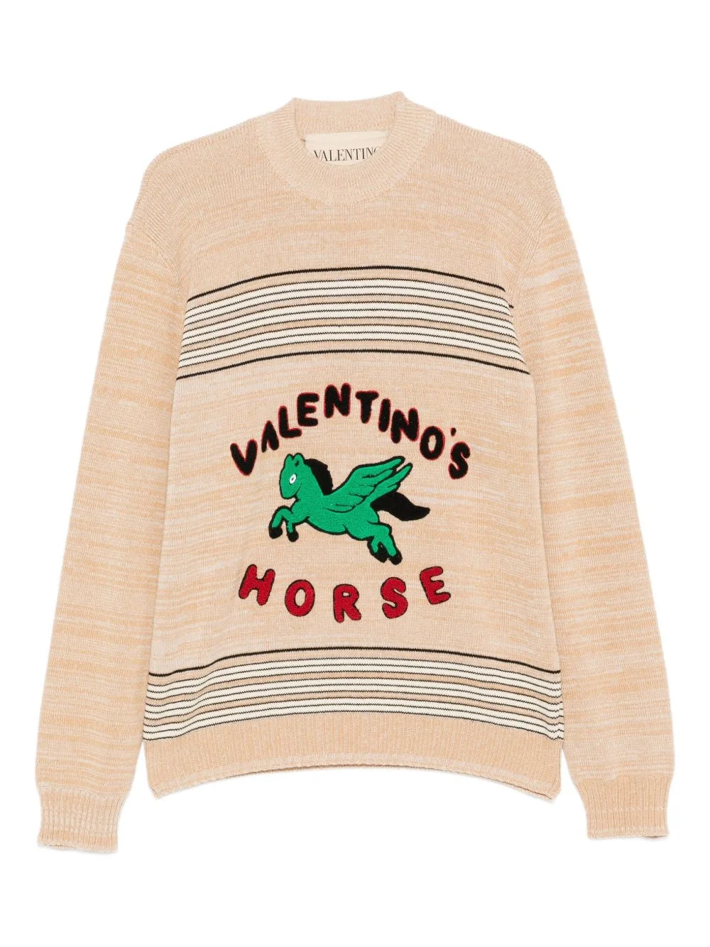pegasus-embroidered striped sweater Highlights - Beige - Embroidered pegasus - Horizontal stripes - Crew neck - Long sleeves - Ribbed cuffs Made in Italy Composition Virgin Wool 52%, Cotton 48% SIZE & FIT Model measurements Height 6 ft 1 in(1.85 m) Bust/Chest 35.82 in(91 cm) Hips 37.79 in(96 cm) Waist 29.13 in(74 cm) Washing instructions Dry Clean Only