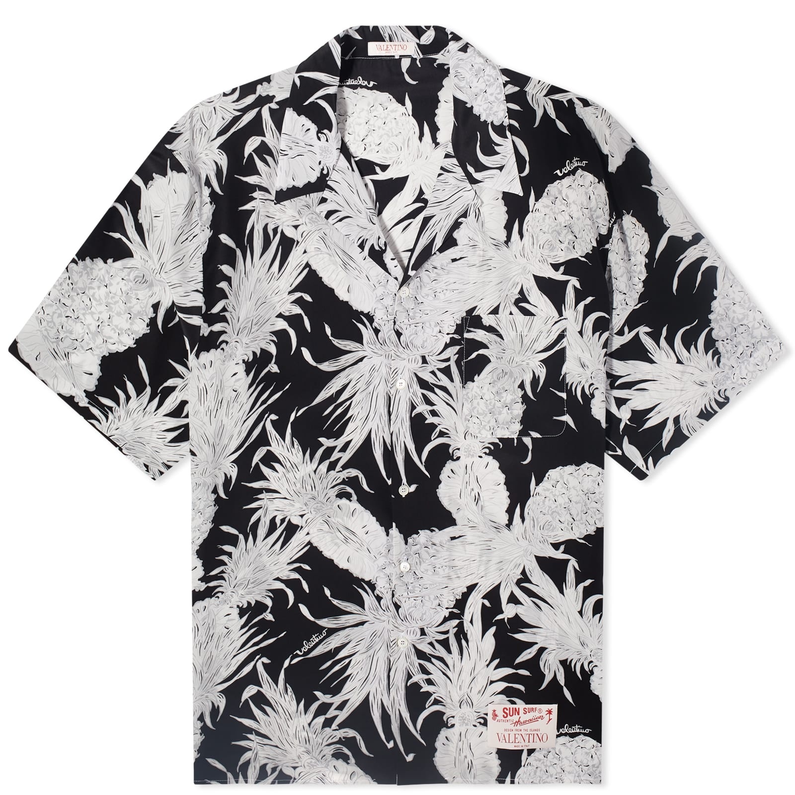 Elevate your tropical vibes with this vacation shirt from Valentino. This piece is all about embracing summer vibes with a touch of elegance. The pineapple print stands out against the black and white background, creating a bold and playful look. Made with attention to detail, this shirt offers a relaxed fit and superior comfort. Get ready to turn heads and make a stylish impression with this one! - 100% Silk - Button Closure - Chest Pocket - Made in Italy