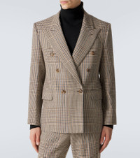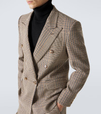 Add this double-breasted blazer from Valentino to your tailoring collection. Made from soft virgin wool, the style is enriched with a classic Prince of Wales check pattern and exquisite jacquard lining. Product Details - Material: 100% virgin wool - Care instructions: dry clean - Made in Italy - Color: beige - Designer color name: Beige/Nero/Verde Militare/Ocra - Material II: 53% linen, 30% wool, 15% viscose, 2% polyester - Pocket lining: 100% viscose - Sleeve lining: 58% acetate, 42% viscose - Lining: 100% viscose - Contains non-textile parts of animal origin - Closure: double-breasted (six buttons) - Cuff: four buttons - Pockets: flap pockets, angled chest pocket, internal pockets - Item number: P01134322 Size & Fit - True to size - Shoulder pad inserts - Regular fit - Non-stretchy fabric - Falls below the hip - Height of model is 189cm-74.5" and wears a size 50