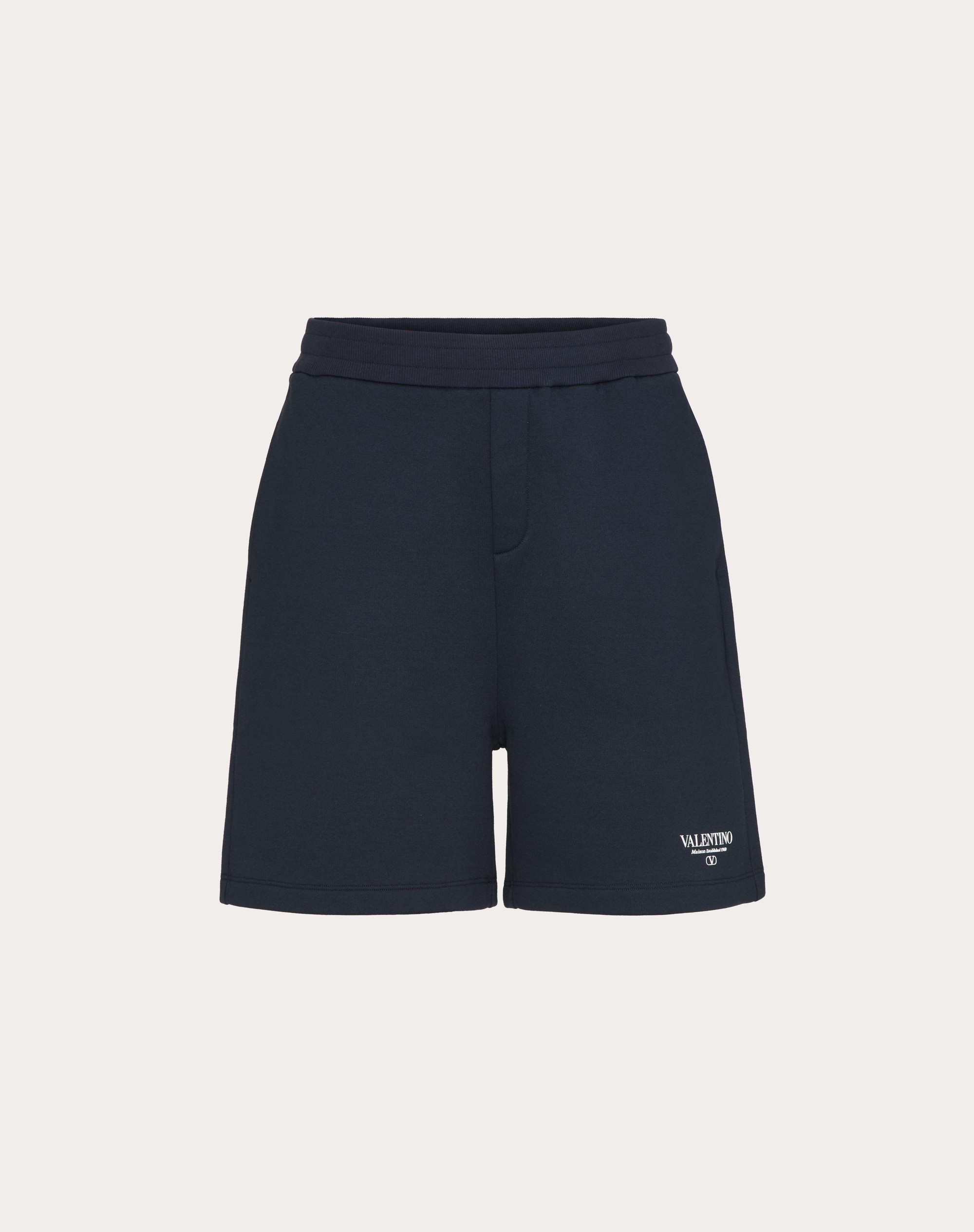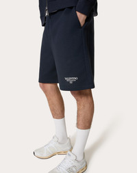Valentino cotton Bermuda shorts with Valentino print - Regular fit - Valentino print on front left side as worn - Elasticated waist - Two side pockets - One rear pocket - Composition: 94% Cotton, 6% Polyamide - Length: 54 cm / 21.3 in. in a size M - Leg opening: 34 cm / 13.4 in. in a size M - The model is 187 cm / 6'1" tall and wears a size M - Made in Italy The look of the model is completed by Valentino Garavani VLogo Easyjog Shoes. Product code: 5V3MD02CAAM_NB4
