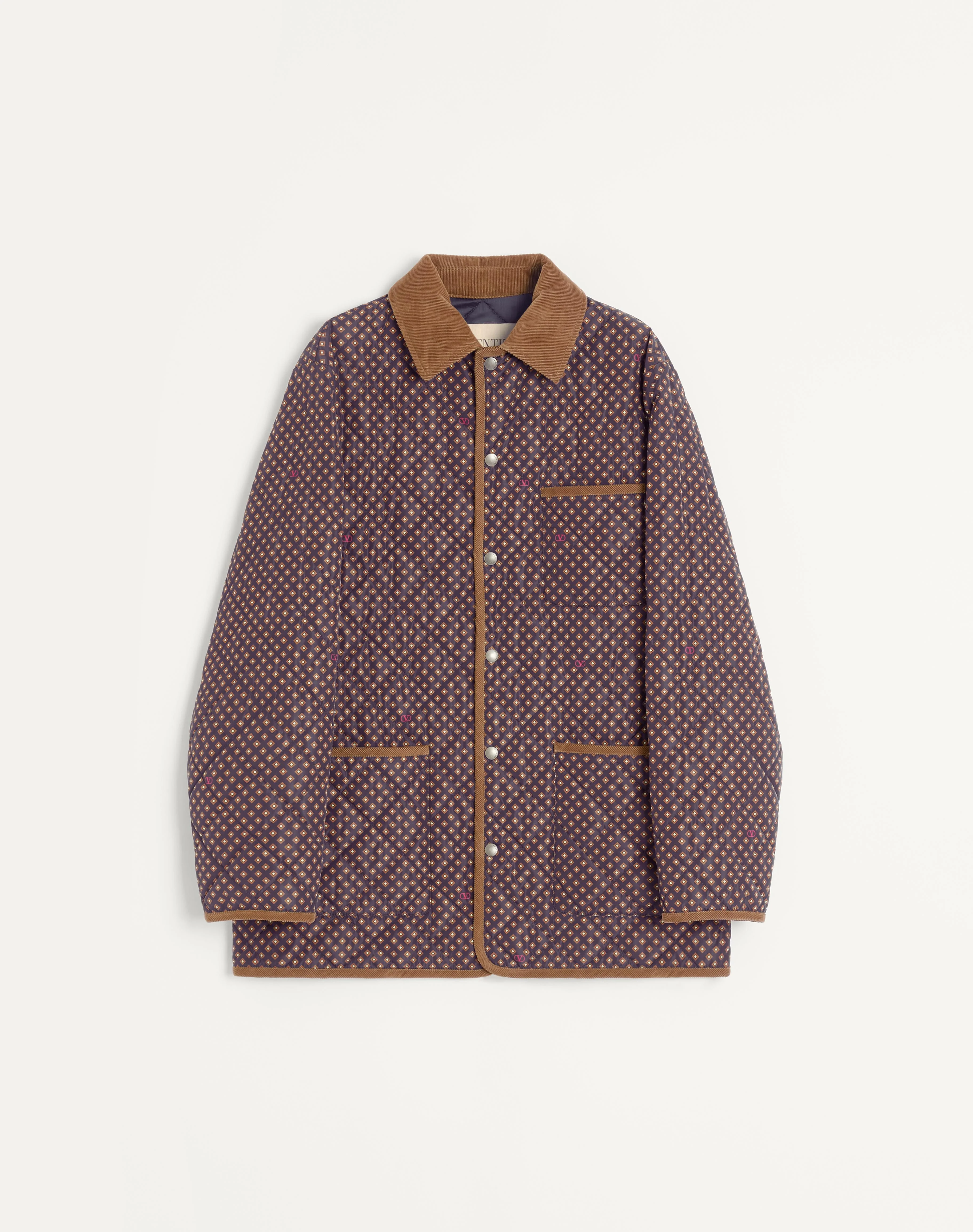 Valentino quilted nylon jacket with Opticool print - Regular fit - Lightly padded - Opticool all-over print - Velvet collar and trim - Two front patch pockets - One pocket on left breast as worn - Composition: 33% Viscose, 30% Polyamide, 25% Polyester, 12% Polypropylene - Padding: 100% Polyester - Length: 80.8 cm / 31.8 in. from the back of the neck in an Italian size 46 - The model is 187 cm / 6'1" tall and wears an Italian size 46 - Made in Italy The look of the model is completed by a Valentino Garavani 9TO5 Bag and Valentino Garavani VLogo Signature Shoes. Product code: 7V3CJK95AYK_CLR