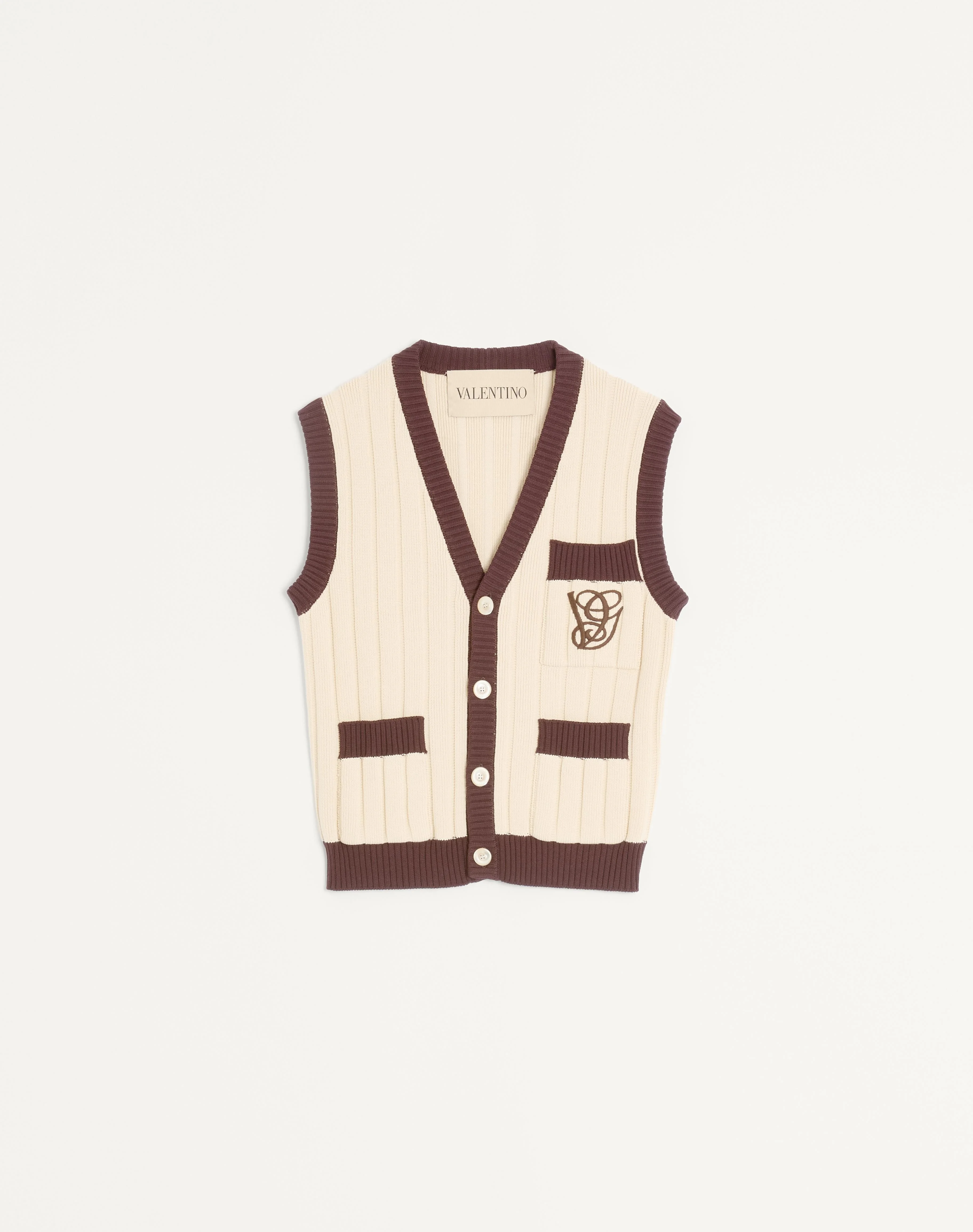 Valentino ribbed cotton vest with VG embroidery - Slim fit - Gauge: 7 - VG embroidery on left chest pocket as worn - Two front patch pockets - Composition: 100% Cotton - Length: 60 cm / 23.6 in. from the back of the neck in a size XS - The model is 187 cm / 6'1" tall and wears a size XS - Made in Italy The look of the model is completed by a Valentino Garavani Nellcote Bag and Valentino Garavani VLogo Signature Shoes. Product code: 7V3K400BB23_BQM