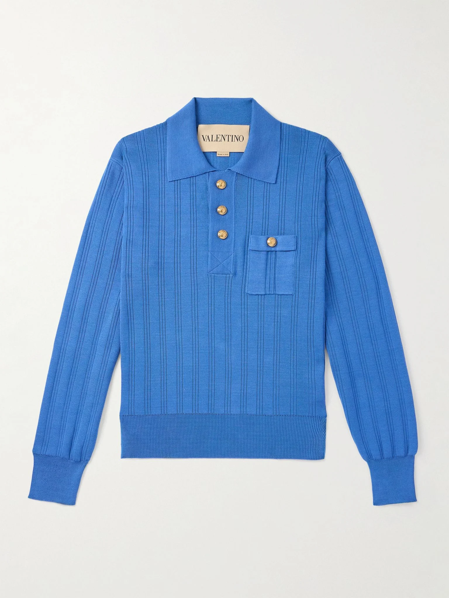 Valentino Garavani's polo shirt has ornate gold-tone buttons that are each embossed with the 'Vlogo' emblem along the placket and chest pocket. It's been made in Italy from 14-gauge cotton and is knitted with fine ribbing for texture. Size & Fit - Fits true to size. Take your normal size - Take the next size up if you wish to achieve a more comfortable fit - Designed for a regular fit - Fine knit - Model is shown wearing a M - Model measures: chest 38"/ 96cm, height 6'0"/ 183cm Details & Care - Blue cotton - Button fastenings - 100% cotton - Dry clean