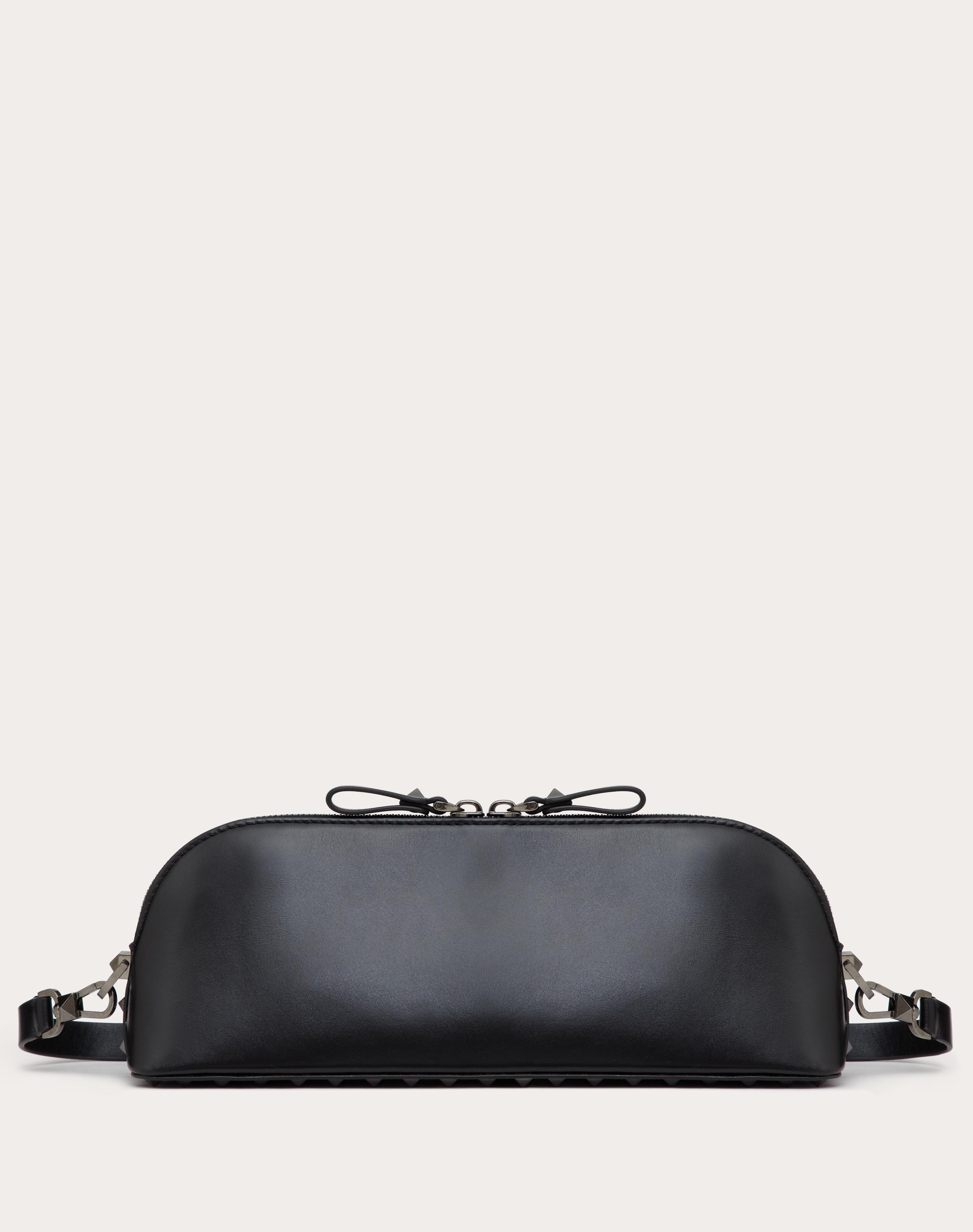 Valentino Garavani Rockstud clutch in calfskin leather. Base covered entirely with studs. The bag can be carried by hand or worn crossbody thanks to the removable shoulder strap and handle. - Ruthenium-finish studs and hardware - Zipper closure - Leather lining. Interior: one card slot - Removable shoulder strap and handle - Shoulder strap drop length: 55 cm / 21.7 in. Handle drop length: 24 cm / 9.4 in. - Dimensions: W28xH20xD10 cm / W11.0xH7.9xD3.9 in. - Made in Italy Product code: 3Y0B0C41ACV_0NO