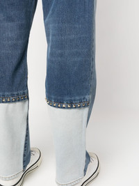 Rockstud-detail straight-leg jeans Cut for a straight leg, these Valentino Garavani trousers are detailed with lighter denim panels on the ankles, highlighted by the brand's signature Rockstuds in a silver-tone. Highlights - Valentino ready to wear - Blue - Cotton - Front button and zip fastening - Belt loops - Classic five pockets - Straight leg - Silver-tone rockstud embellishment Made in Italy Composition Outer: Cotton 100%, Calf Leather 100% Lining: Polyester 65%, Cotton 35% SIZE & FIT Model measurements Height 6 ft 1 in(1.86 m) Bust/Chest 34.64 in(88 cm) Hips 35.43 in(90 cm) Waist 27.55 in(70 cm) FittingInformation This piece fits true to size. We recommend you get your regular size Regular fit Made with a mid-weight non-stretch fabric Measurement FRONT RISE 12.2 in(31 cm) INSIDE LEG 30.7 in(78 cm) HIPS 43.89 in(111.5 cm) Washing instructions Hand Wash