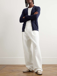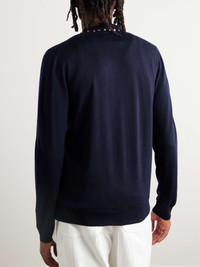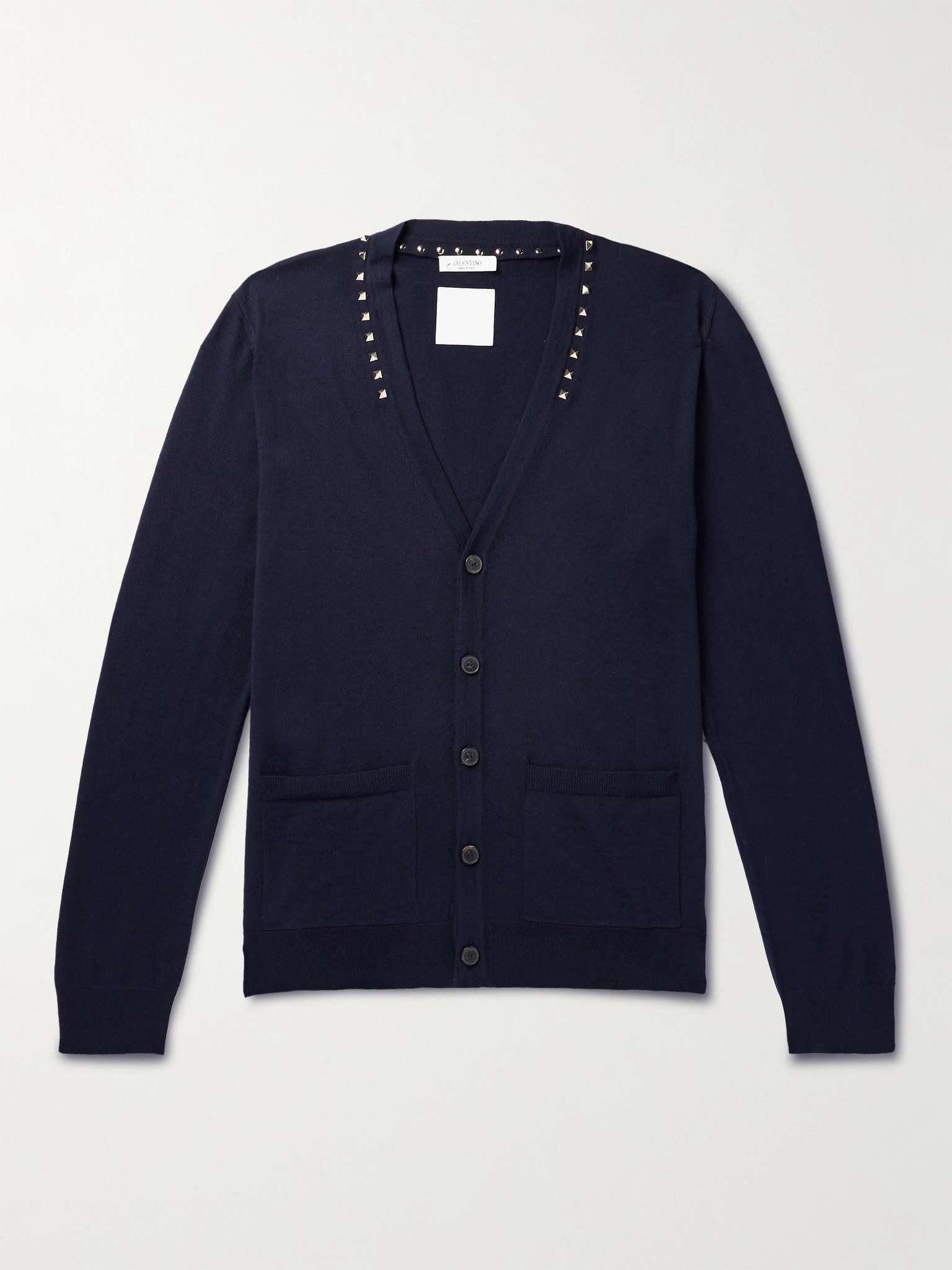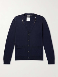 It's easy to spot a Valentino Garavani design when it's embellished with the label's 'Rockstuds'. This cardigan has been knitted in Italy from soft wool and features the signature silver-tone hardware tracing the collar. Wear yours layered over a crisp white tee. Size & Fit - Those with broad shoulders may wish to take the next size up - Mid-weight knit - Model is shown wearing a M - Model measures: chest 36"/ 92cm, height 6'1"/ 185cm Details & Care - Navy wool - Button fastenings - 100% wool; buttons: 100% horn (Buffalo) - Dry clean