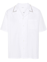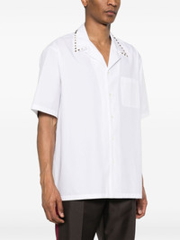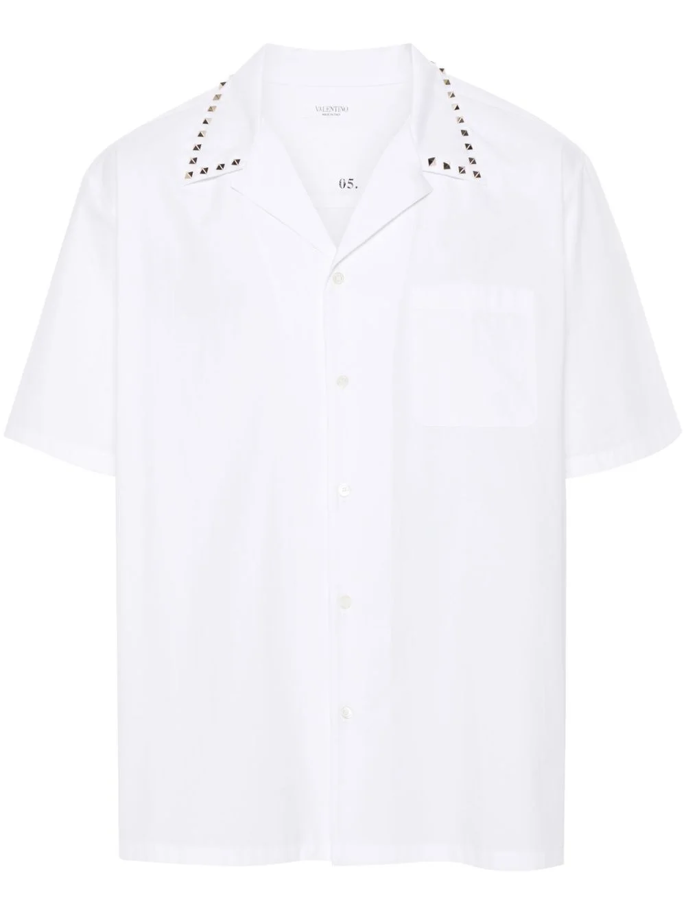 Rockstud-embellished bowling shirt Adorned with Valentino Garavani's unmistakable Rockstud Untitled studs, this shirt testifies to the brand’s iconic sense of elegance. Thanks to their distinctive golden hue, the iconic accents at the collar stand out against the white cotton construction. Highlights - Valentino ready to wear - White - Cotton - Pointed flat collar with signature rockstud detailing - Short sleeves - Chest patch pocket - Straight hem - Gold-tone hardware - Front button fastening Made in Italy Composition Cotton 100% SIZE & FIT Model measurements Height 6 ft 2 in(1.87 m) Bust/Chest 37 in(94 cm) Hips 33.85 in(86 cm) Waist 27.95 in(71 cm) FittingInformation Designed to be unstructured, offering a loose fit throughout Made from a midweight non-stretch fabric This piece fits true to size – take your usual size Washing instructions Dry Clean Only