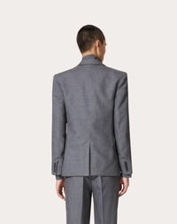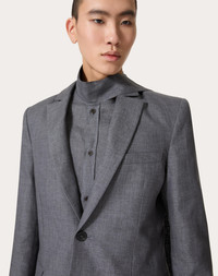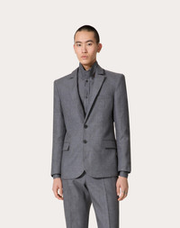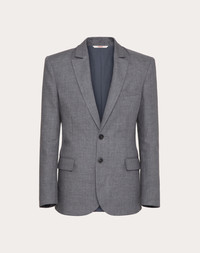 Valentino single-breasted jacket in linen bonded to scuba fabric - Garment made using heat-sealing technique: the outer linen fabric is joined and bonded with an adhesive to an inner layer of neoprene scuba fabric - Slim fit - Button fastening - Two front patch pockets - One pocket on left breast as worn - Composition: 100% Linen - Length: 74 cm / 29.1 in. from the back of the neck in an Italian size 46 - The model is 187 cm / 6'1" tall and wears an Italian size 46 - Made in Italy The look of the model is completed by Valentino Garavani Fussfriend Shoes. Product code: 5V3CEF60A9F_093