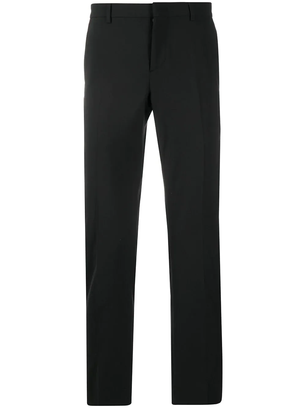 slim-fit tailored trousers If you're one of those persons that like to stick with the classics, there's nothing wrong with that. Constructed from virgin wool blend, these slim-fit tailored trousers from Valentino Garavani are a safe option on those days that you don't know what to wear. Classy and elegant! Highlights - Valentino ready to wear - Black - Virgin wool blend - Belt loops - Concealed front fastening - Two diagonal pockets to the sides - Two rear button fastening pockets Made in Italy Composition Lining: Cotton 100% Outer: Polyester 53%, Virgin Wool 43%, Spandex/Elastane 4% SIZE & FIT Model measurements Height 6 ft 2 in(1.87 m) Bust/Chest 38.18 in(97 cm) Hips 36.61 in(93 cm) Waist 29.13 in(74 cm) FittingInformation This piece fits true to size. We recommend you get your regular size Cut for a slim fit Made with a mid-weight non-stretch fabric Washing instructions Read Manufacturer Guidelines
