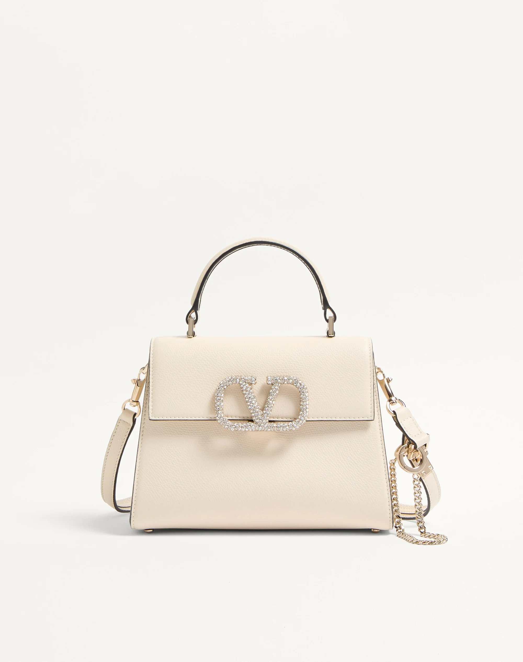 Valentino Garavani VSLING small handbag in grainy calfskin and VLogo Signature closure covered in Swarovski® crystals. The bag can be worn on the shoulder/crossbody thanks to its extendable shoulder strap, and handheld thanks to its handle. - Platinum-finish logo and hardware - Magnetic logo closure - Leather shoulder strap with adjustable chain element - Protective feet - Nappa leather lining. Interior: one zipper pocket Shoulder strap drop length: min. 45 cm to max. 59 cm / min. 17.7 in. to max. 23.2 in. - Dimensions: W22xH17xD9 cm / W8.6xH6.6xD3.5 in. - Made in Italy This product contains magnets. Please consider if this product will be worn within 15 cm from any implanted device. Any concerns please contact your healthcare professional. Product code: 7W2B0F53YVV_IA5