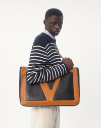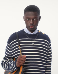 Valentino striped cotton crew neck sweater with buttons on the shoulder - Regular fit - Gauge: 7 - Buttons applied on the left shoulder as worn - Composition: 100% Cotton - Length: 65 cm / 25.5 in. from the back of the neck in a size M - The model is 187 cm / 6'1" tall and wears a size M - Made in Italy The look of the model is completed by a Valentino Garavani Bag and Valentino Garavani VLogo Signature Shoes. Product code: 6V3KC33MAR6_RGX