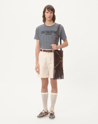 Valentino striped cotton T-shirt with Chez Valentino print - Slim fit - Chez Valentino print on chest - Composition: 100% Cotton - Length: 68 cm / 26.7 in. from the back of the neck in a size M - The model is 187 cm / 6'1" tall and wears a size M - Made in Italy The look of the model is completed by a Valentino Garavani Antibes Bag and Valentino Garavani Palm Avenue Shoes. Product code: 6V3MG16SAPY_RGY