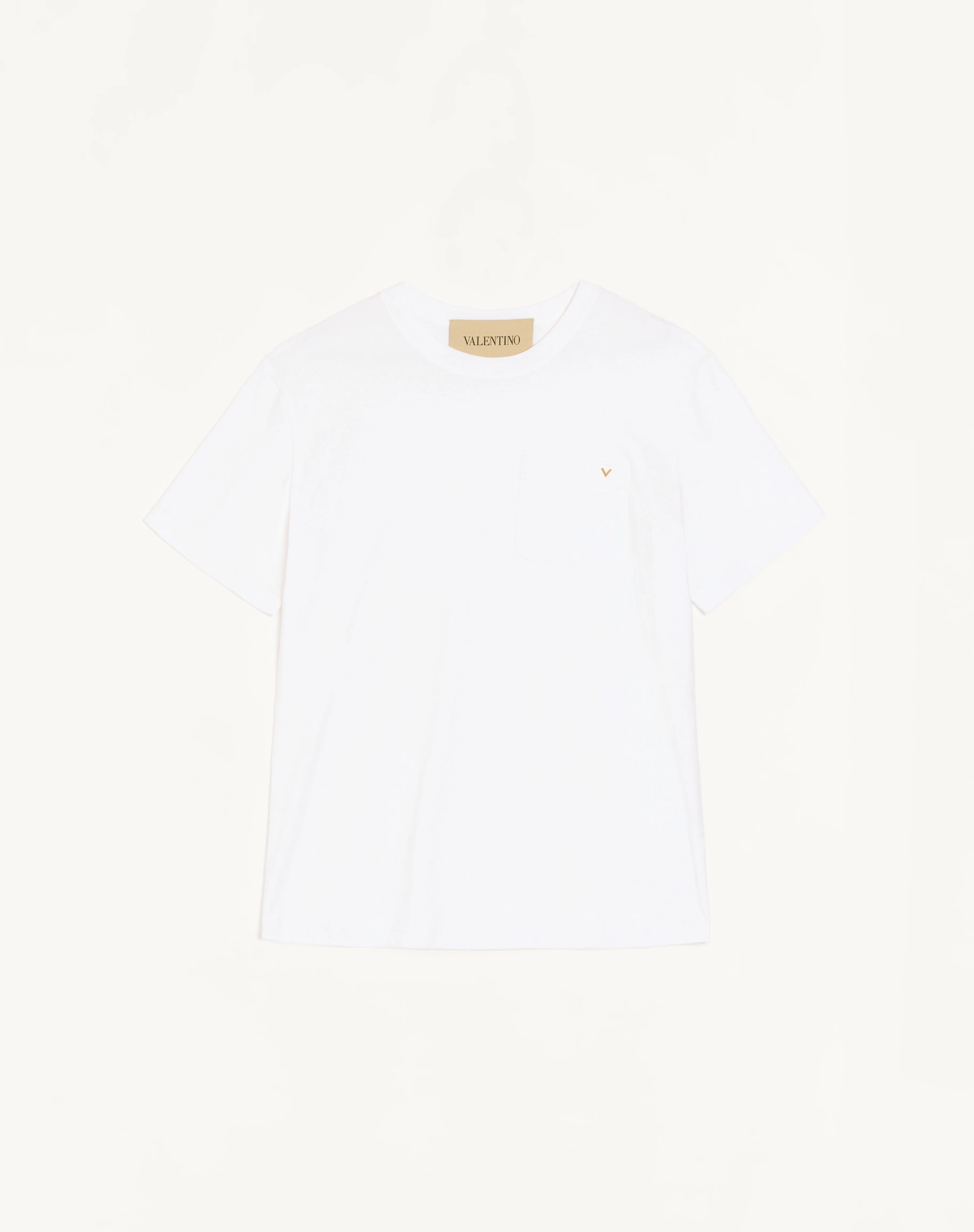 Valentino cotton t-shirt with VGold - Regular fit - VGold applique on left breast pocket as worn - Composition: 100% Cotton - Length: 70 cm / 27.6 in. from the back of the neck in an Italian size M - The model is 187 cm / 6'1" tall and wears an Italian size M - Made in Italy The look of the model is completed by Valentino Garavani Royco Shoes. Product code: 8V0MG10VBGR_0BO