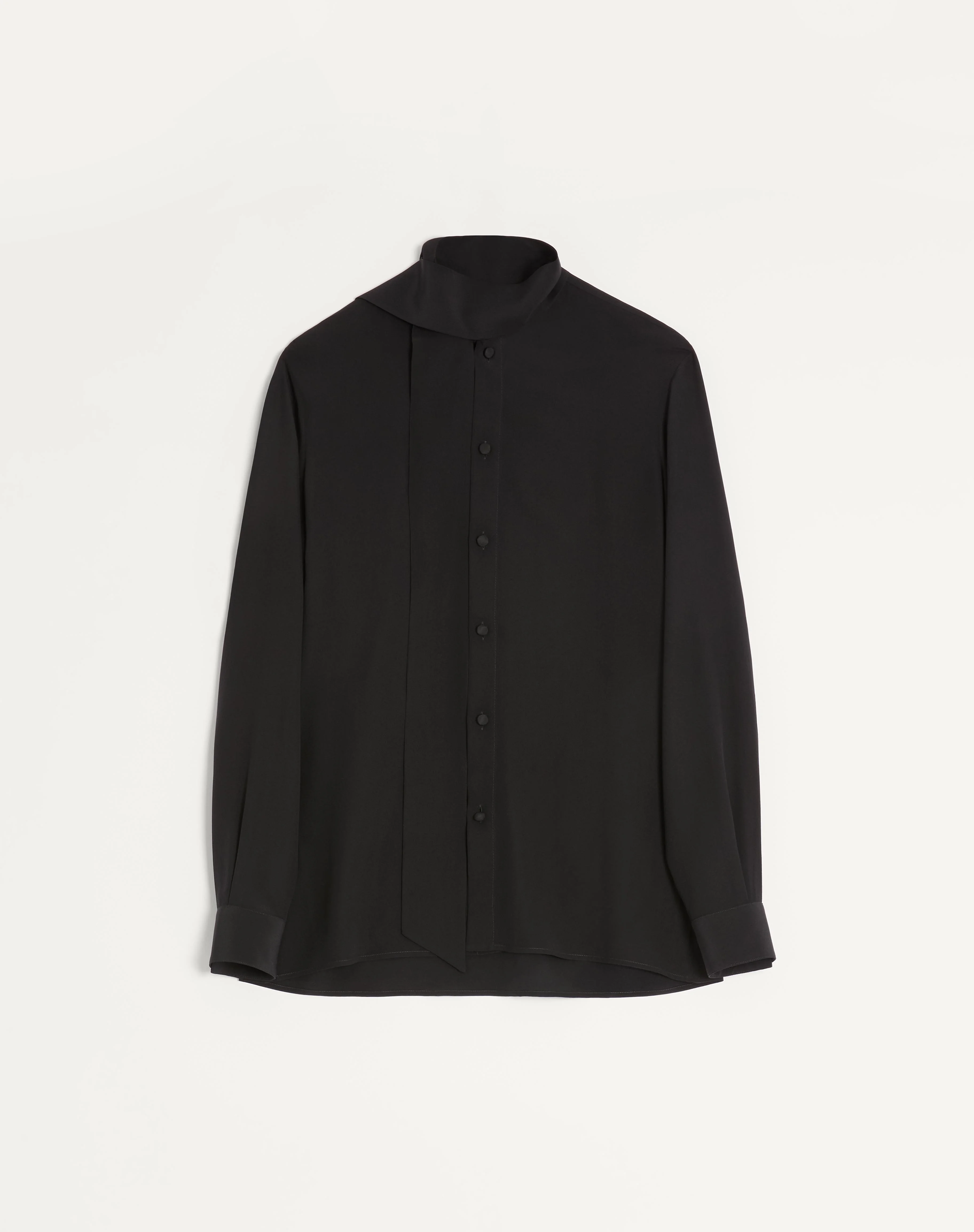 Valentino crepe de chine silk shirt with scarf collar - Slim fit - Scarf collar - Composition: 100% Silk - Length: 78.4 cm / 30.9 in. from the back of the neck in an Italian 39 - The model is 187 cm / 6'1" tall and wears an Italian size 39 - Made in Italy The look of the model is completed by a Valentino Garavani Nellcote Bag and Valentino Garavani Babouchoues Shoes. Product code: 7V0ABT01B3N_0NO