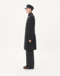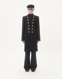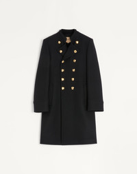 Valentino double-breasted coat in double wool - Regular fit - Lined Mandarin collar - Two side pockets - Composition: 73% Wool, 27% Polyamide - Lining: 100% Cupro - Length: 105 cm / 41.3 in. from the back of the neck in an Italian size 46 - The model is 187 cm / 6'1" tall and wears an Italian size 46 - Made in Italy The look of the model is completed by a Valentino Garavani Bag and Valentino Garavani Babouchoues Shoes. Product code: 7V0CAK358U4_0NO