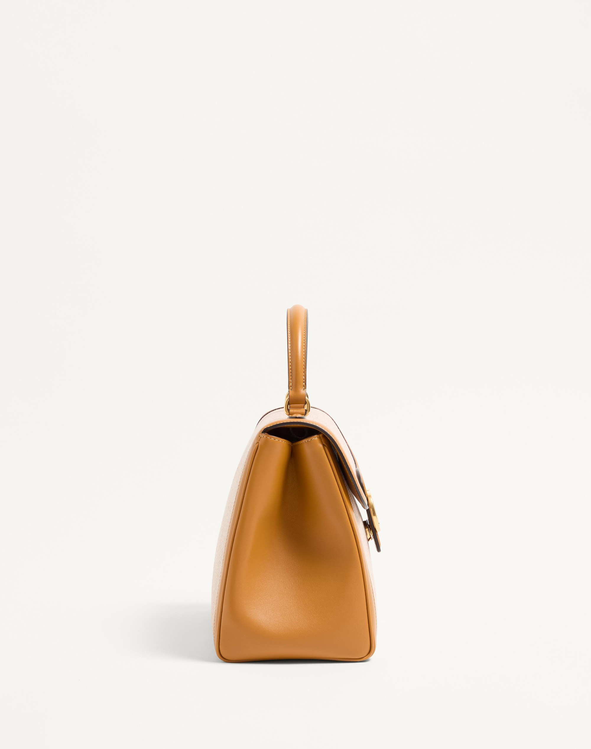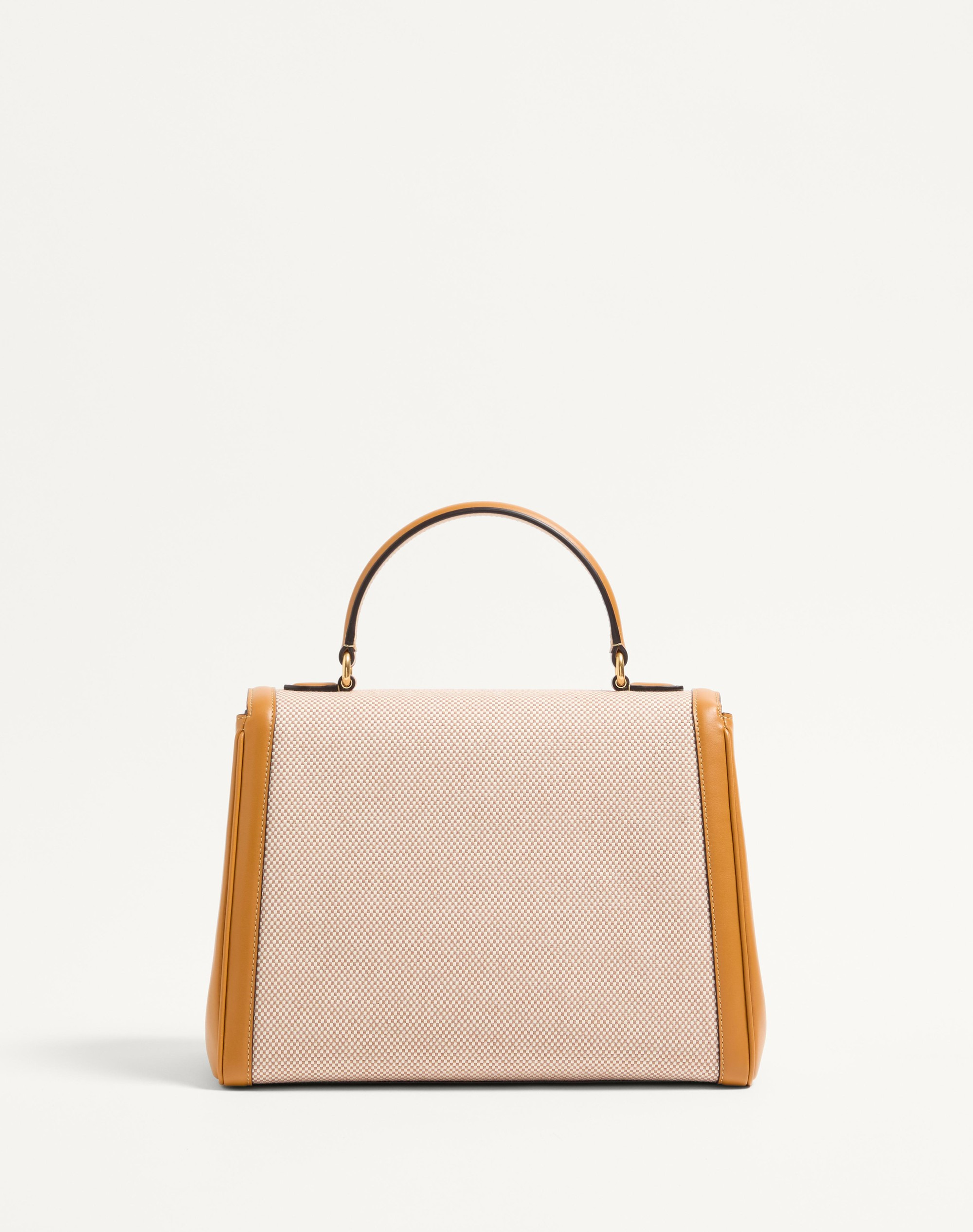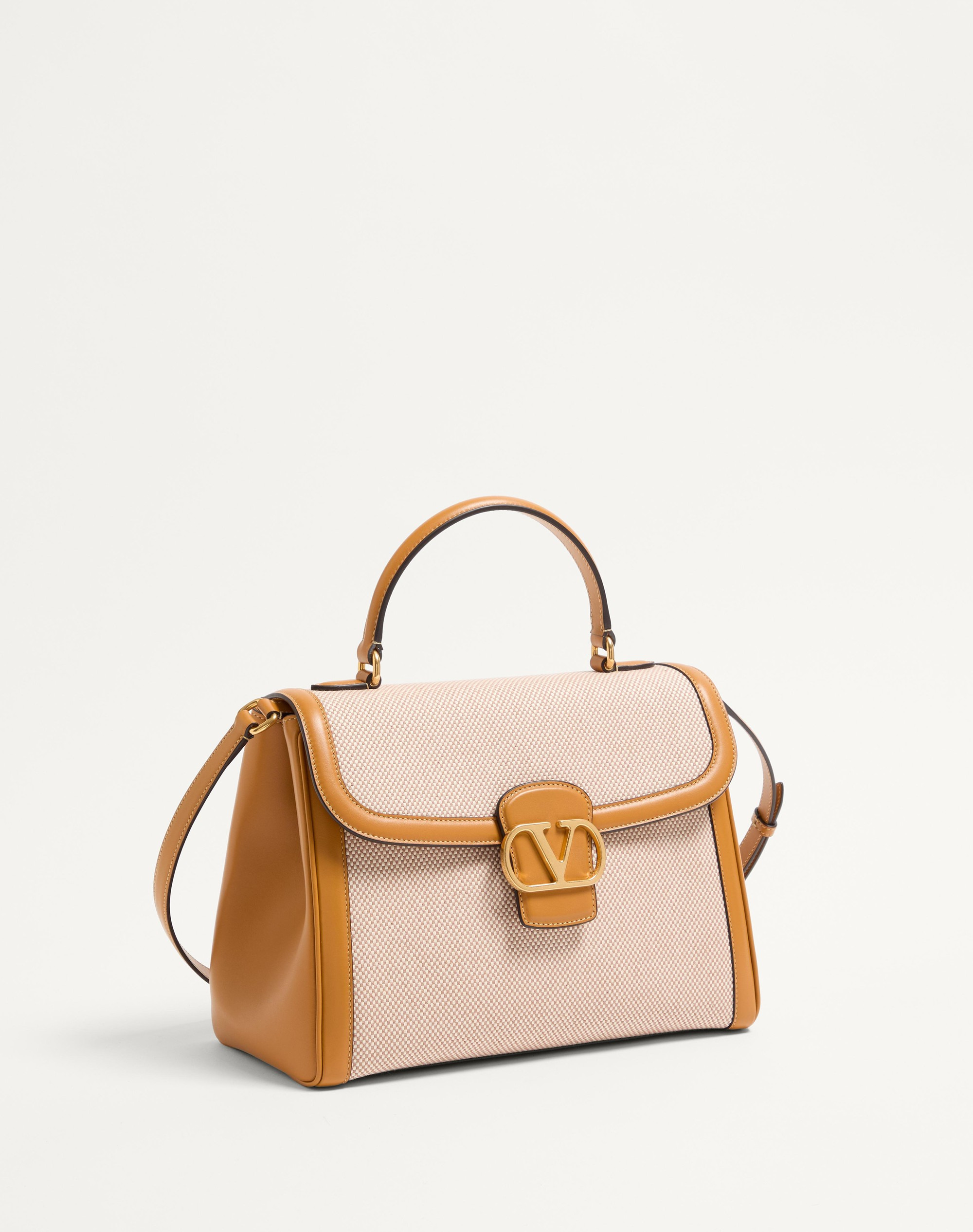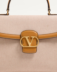 Valentino Garavani 9TO5 canvas handbag, leather trim and VLogo Signature closure. The bag can be worn on the shoulder/crossbody thanks to its adjustable strap, or carried by hand using its handle. Antique brass-finish hardware - Magnetic closure with logo - Adjustable and removable leather shoulder strap - Protective feet - Nappa leather lining. Interior: two compartments, slip pocket with button - Shoulder strap drop length: 35 cm / 13.8 in. at the centre hole - Dimensions: W27.5xH22.5xD14 cm / W10.8xH8.9xD5.5 in. - Made in Italy This product contains magnets. Please consider if this product will be worn within 15 cm from any implanted device. Any concerns please contact your healthcare professional. Product code: 7W2B0R87LWU_REK