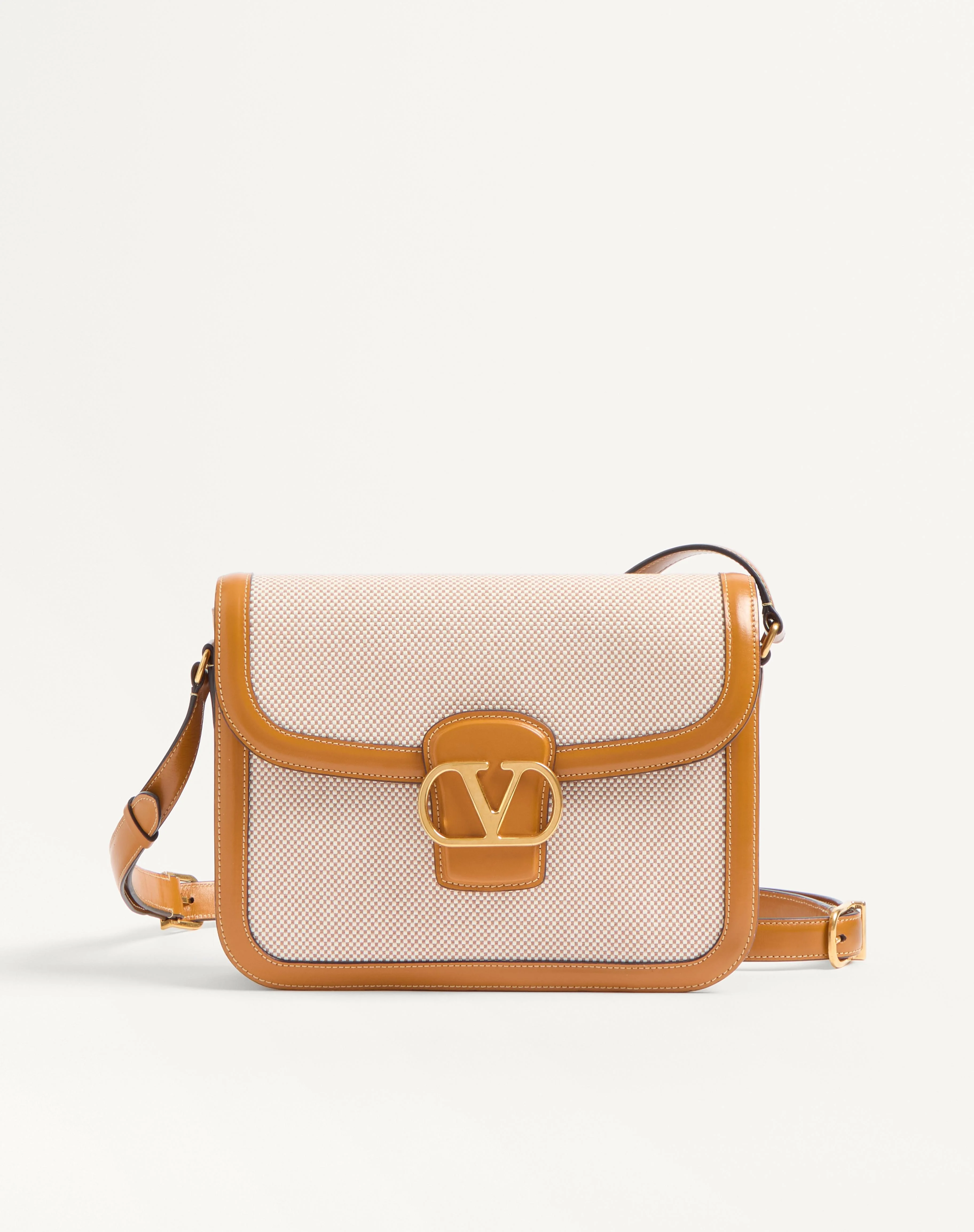 Valentino Garavani 9TO5 canvas shoulder bag, leather trims and VLogo Signature closure. The bag can be carried on the shoulder/cross-body thanks to the adjustable leather shoulder strap. - Antique brass-finish hardware - Magnetic closure with logo - Nappa leather lining. Interior: three compartments, slip pocket with button - Shoulder strap drop length: 33 cm / 12.9 in. at the center hole - This model has an additional section of a leather shoulder strap that can be attached to the bag by buckles - Shoulder strap drop length with additional section: 48 cm / 18.8 in. at the central hole - Dimensions: W24.5xH18.5xD8 cm / W9.6xH7.2xD3.1 in. - Made in Italy Product code: 6Y2B0D05ZJE_REK
