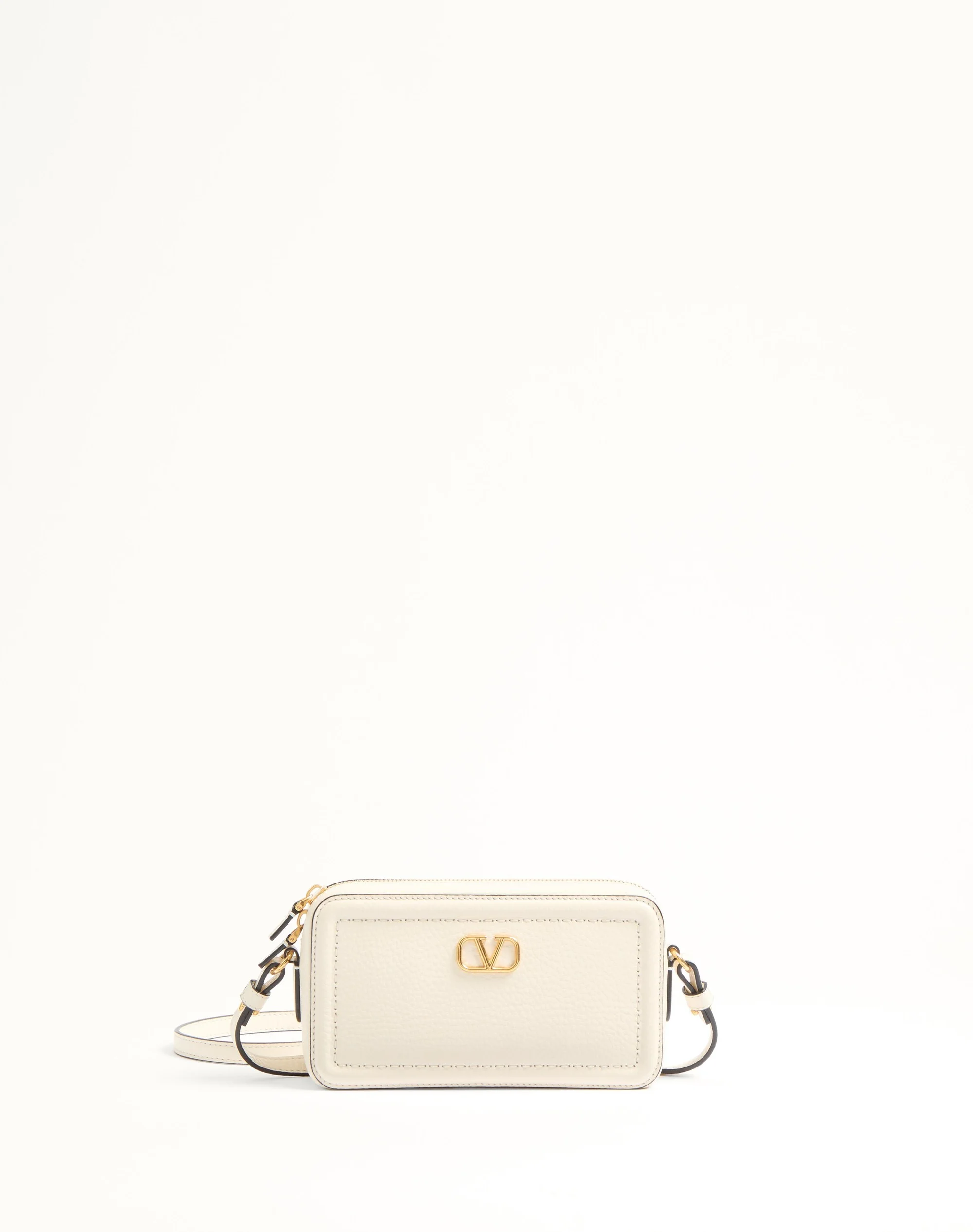 Valentino Garavani Alltime mini shoulder bag in grainy calfskin. Can be worn on the shoulder/crossbody thanks to the adjustable leather shoulder strap. - Logo and hardware with antique brass finish - Zipper closure - Adjustable leather shoulder strap. Shoulder strap drop length: 53 cm / 20.9 in. - Interior: one card slot - Dimensions: W19xH10xD4.5 cm / W7.5xH3.9xD1.8 in. - Made in Italy Product code: 6W2P0AI5RZR_098