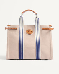 Valentino Garavani Antibes canvas shopping bag with side buckle details and leather patches featuring a VLogo Signature metal element. - Gold-tone hardware - Calfskin details - Protective feet - Canvas lining. Interior: slip pocket with zipper - Double leather handles - Handle drop length: 14 cm / 5.5 in. - Dimensions: W41xH33xD20 cm / W16.1xH13.0xD7.9 in. - Made in Italy Product code: 6Y2B0D18NDZ_QXJ