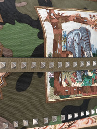 Valentino Garavani appliqued messenger bag Green canvas Valentino Garavani appliqued messenger bag from Valentino featuring Rockstud embellishments, a front flap closure, a detachable shoulder strap, an internal zipped pocket and an internal logo patch. Made in Italy Composition Outer: Canvas 100% SIZE & FIT Model measurements Height 6 ft 1 in(1.86 m) Bust/Chest 37.4 in(95 cm) Hips 37.4 in(95 cm) Waist 29.92 in(76 cm) Measurement WIDTH 14.96 in(38 cm) HEIGHT 11.41 in(29 cm) DEPTH 5.11 in(13 cm) STRAP 26.77 in(68 cm)