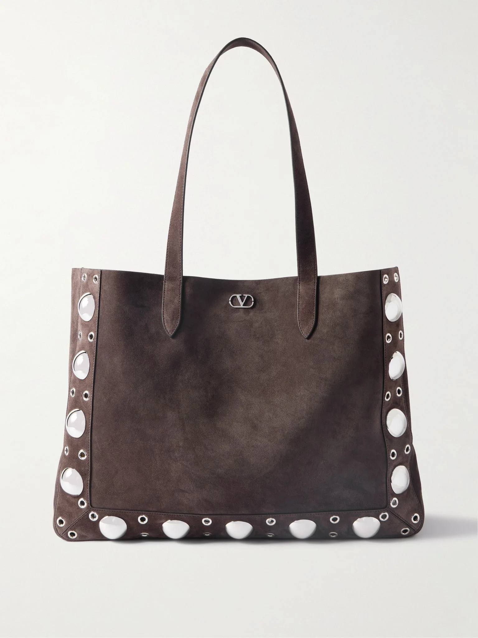 Valentino Garavani's 'Nellcote' tote bag is part of Alessandro Michele's first-ever collection for the iconic house. Inspired by the 1960s and ‘70s, it's been made in Italy from supple suede and is traced with silver-tone studs and eyelets. The generous size and detachable zipped pouch make it practical for every day. Details & Care - Dark-brown suede (Cow) - Top handles - Internal detachable zipped pouch - Unlined - Comes with a dust bag