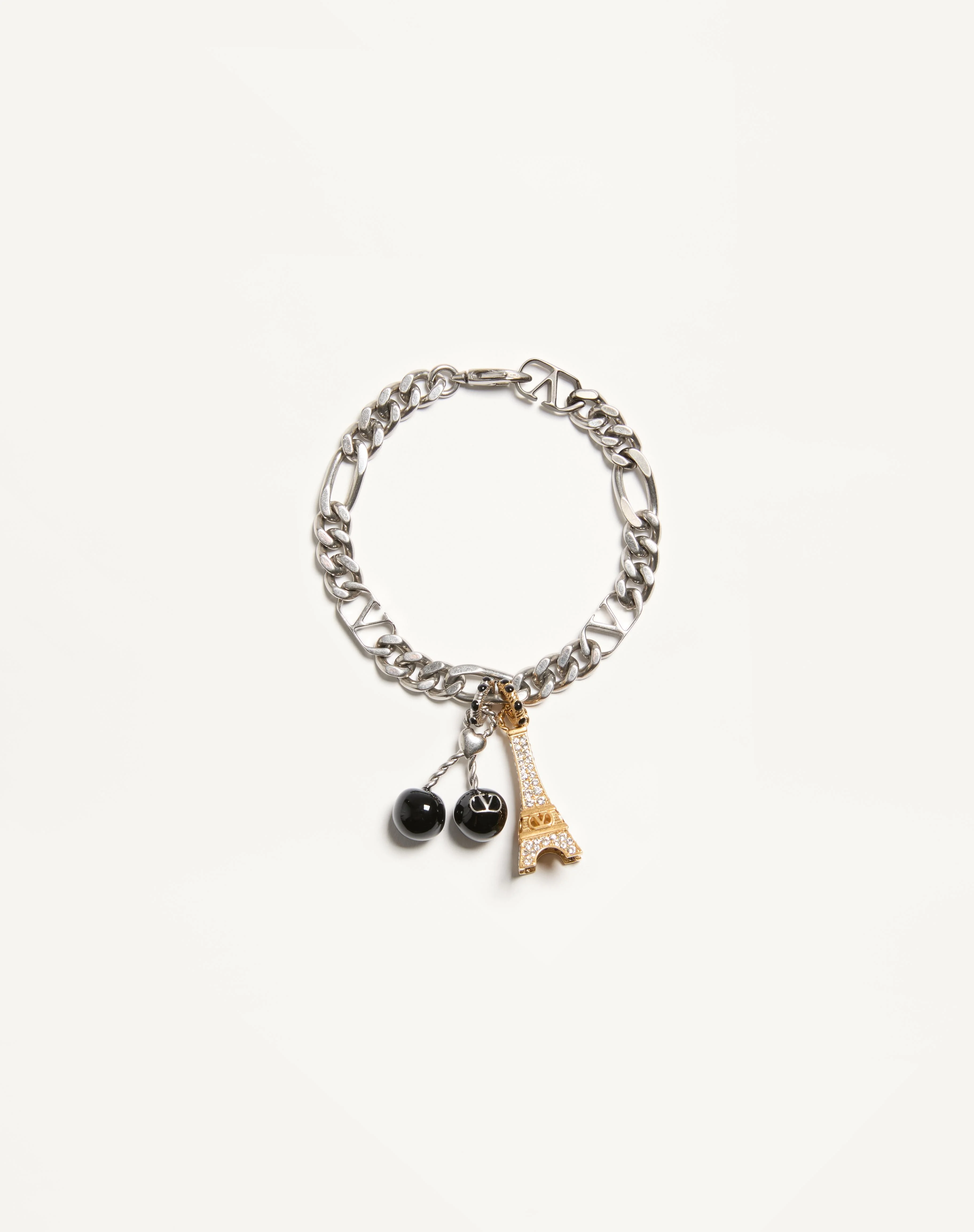 Valentino Garavani Chez Valentino bracelet in metal, enamel, and Swarovski® rhinestones. - Palladium and antique brass-effect finish - Cherry-shaped pendant in metal and enamel with VLogo Signature detail and Eiffel Tower-shaped pendant in metal and Swarovski® rhinestones with VLogo Signature detail - Available in sizes: 20 cm (M) - 21 cm (L) / 7.9 in. (M) - 8.3 in.(L) - Snap hook closure - Made in Italy Product code: 7Y2J0AL3VTI_ANR