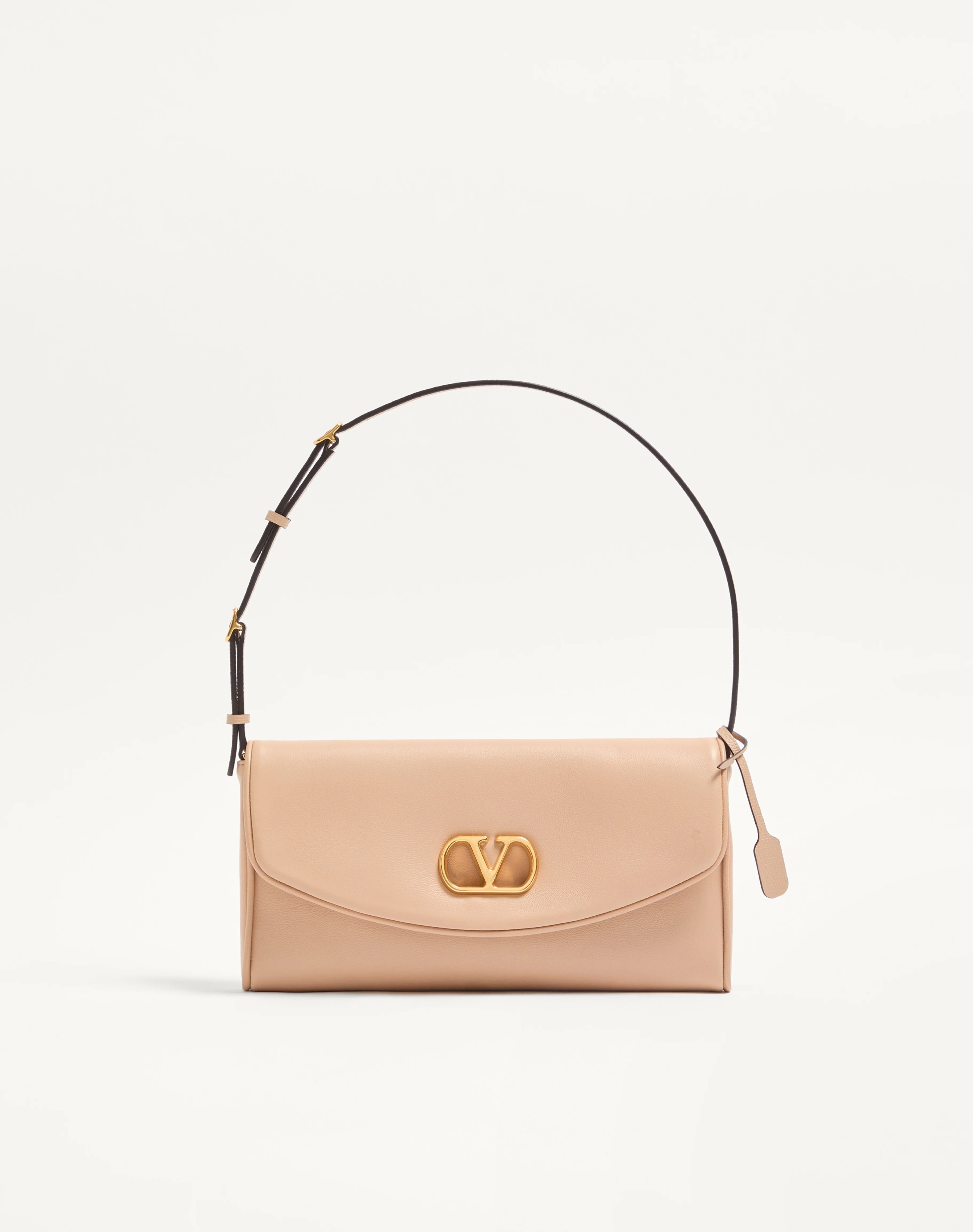 Valentino Garavani DeVain small shoulder bag in nappa leather with metallic VLogo Signature detail. The bag can be carried by hand or over the shoulder. - Antique brass-finish hardware - Details and adjustable handle in grainy calfskin - Magnetic closure with VLogo in antique brass finish - Nappa leather lining. Interior: single compartment, slip pocket - Handle drop length: 14 cm / 5.5 in. at the center hole - This model has an additional leather section that can be attached to the bag with buckles - Handle drop length with additional section: 19 cm / 7.5 in. at the center hole - Removable leather tag with Valentino Garavani stamp - Dimensions: W23.5 x H12 x D3 cm / W9.3 x H4.7 x D1.2 in. - Made in Italy This product contains magnets. Please consider if this product will be worn within 15 cm from any implanted device. Any concerns please contact your healthcare professional. Product code: 8W2B0T31ABM_WRP