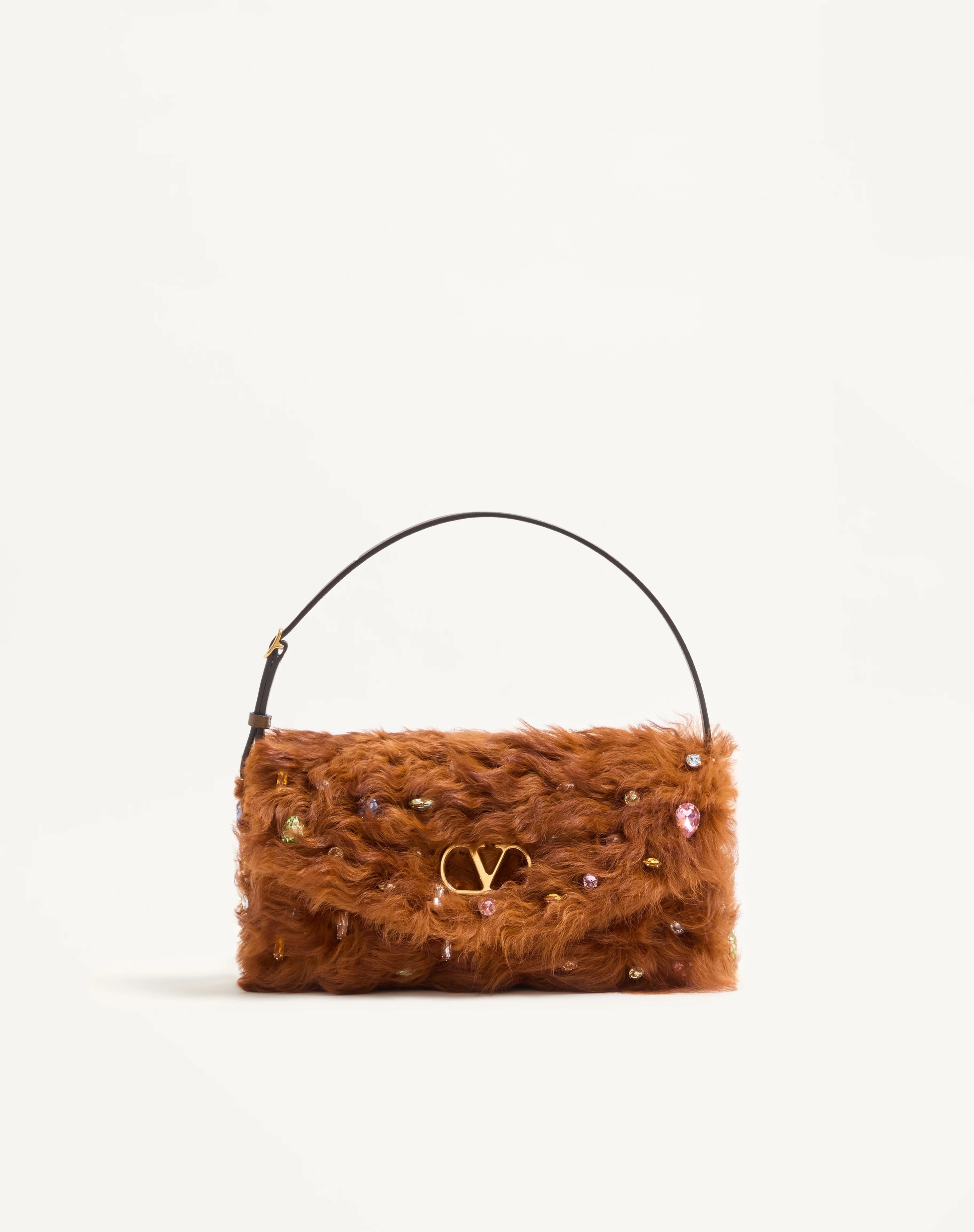 Valentino Garavani DeVain small shoulder bag in lambskin fur with rhinestones and metallic VLogo Signature detail. The bag can be carried by hand or worn over the shoulder. - Antique brass-finish hardware - Details and adjustable handle in grainy calfskin - Magnetic closure with VLogo in antique brass finish - Suede lining. Interior: slip pocket - This model has an additional leather section that can be attached to the bag with buckles - Handle strap drop length: 14 cm / 5.5 in. at the centre hole - Handle strap drop length: 14 cm / 5.5 in. at the centre hole - Dimensions: W23.5xH12xD3 cm / W9.2xH4.7xD1.2 in. - Made in Italy This product contains magnets. Please consider if this product will be worn within 15 cm from any implanted device. Any concerns please contact your healthcare professional. Product code: 7W0B0S14HUC_ACM