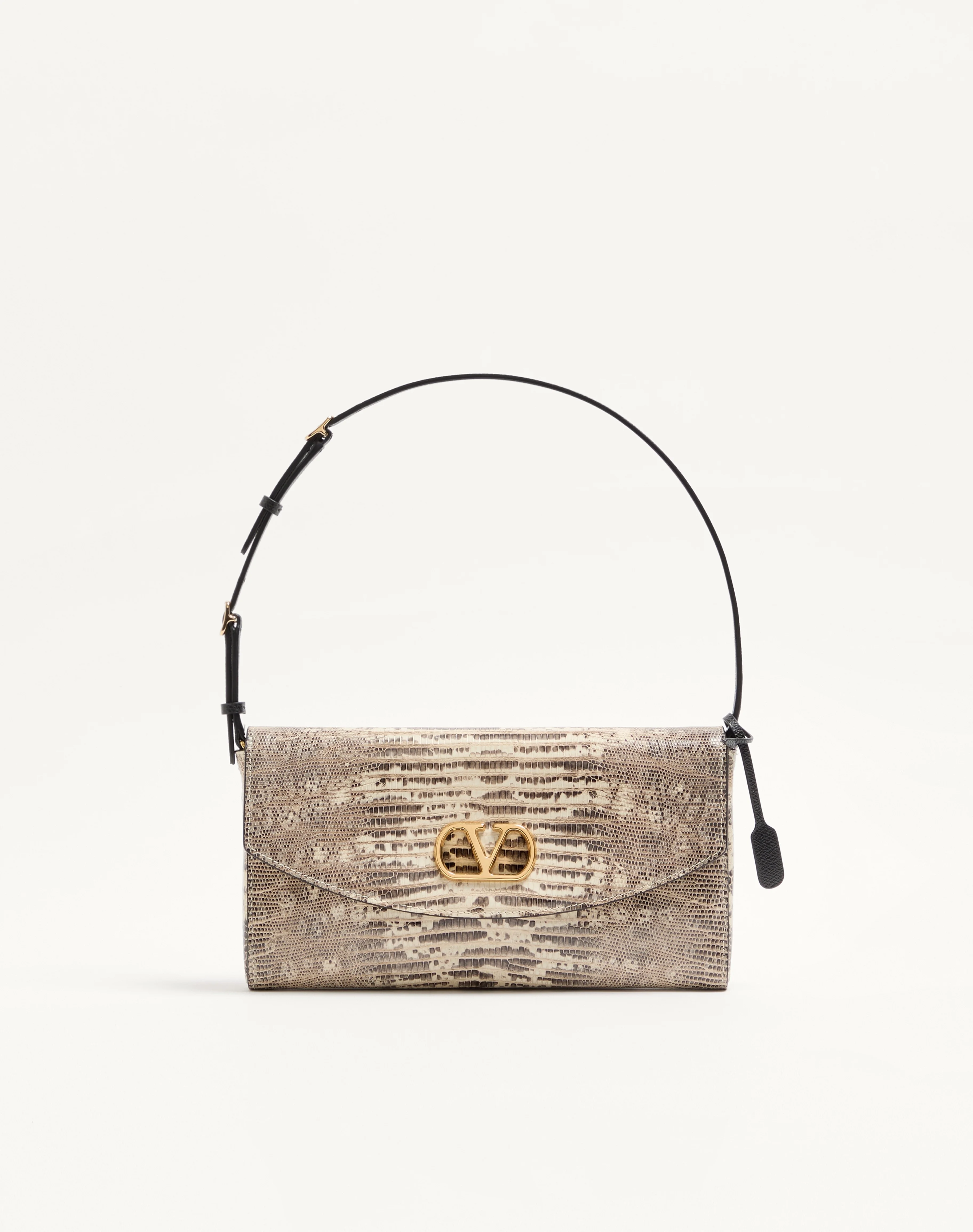 Valentino Garavani DeVain small shoulder bag in tejus with metallic VLogo Signature detail. The bag can be carried by hand or over the shoulder. - Gold-finish hardware - Details and adjustable handle in grainy calfskin - Magnetic closure with gold-finish VLogo - Nappa lining - Interior: single compartment, slip pocket - Handle drop length: 14 cm / 5.5 in. at the center hole - This model has an additional leather section that can be attached to the bag with buckles - Handle drop length with additional section: 19 cm / 7.5 in. at the center hole - Removable leather tag with Valentino Garavani stamp - Dimensions: W23.5 cm x H12 cm x D3 cm / W9.3 cm x H4.7 cm x D1.2 in. - Made in Italy This product contains magnets. Please consider if this product will be worn within 15 cm from any implanted device. Any concerns please contact your healthcare professional. Product code: 8W0B0T40JII_XU0