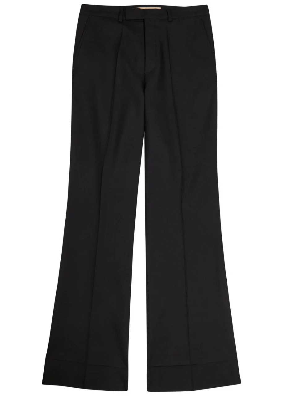 Info & Care Valentino twill trousers Belt loops, side slip pockets, pressed crease through legs, two back;slit pockets Concealed button, hook and zip fastenings at front 55% polyester, 45% wool Dry clean Size & Fit Inside leg length:;36 inches/ 91.5cm Midweight Flared-leg cut Model is 6'1"/ 185cm and wears a size;IT48 Please note, cuffs are left unfinished to allow for leg alterations