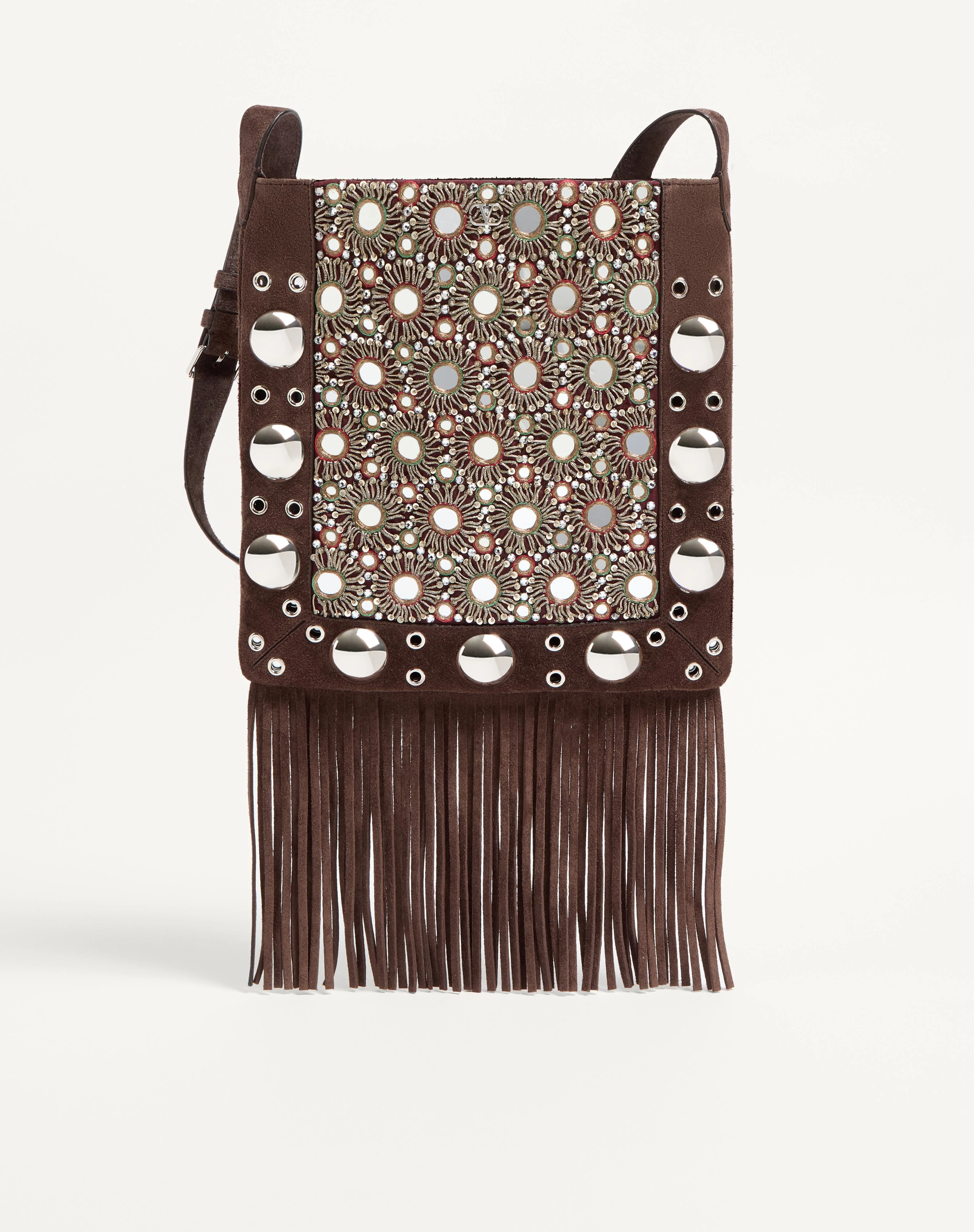 Valentino Garavani Nellcote shoulder bag with mirror embroidery and trim decorated with ball studs and rivets. The bag can be comfortably worn on the shoulder/crossbody thanks to the adjustable suede shoulder strap. - Palladium-finish hardware - Small metallic detail with VLogo Signature - Shoulder strap drop length: 45 cm / 17.7 in. at the center hole - Dimensions: W30xH31xD3 cm / W11.8xH12.2xD1.2 in. - Made in Italy Product code: 7Y2B0R33TAA_RCB
