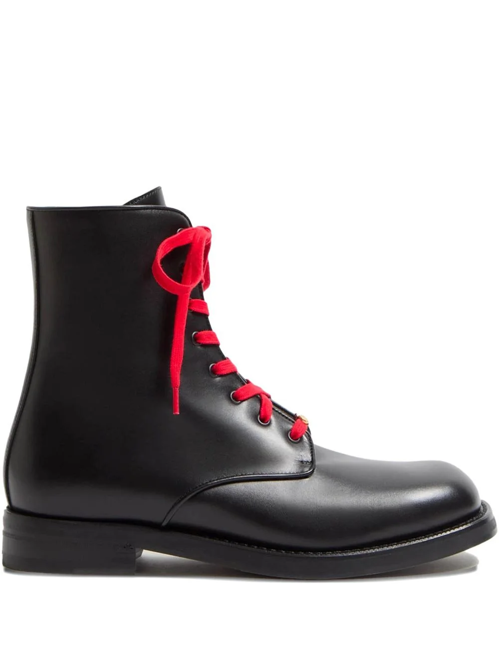 lace-up leather boots Highlights - Black - Leather upper - Red laces - Gold-tone logo detail - Flat sole - Ankle height Made in Italy Composition Outer: Calf Leather 100%