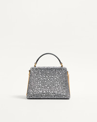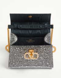 Valentino Garavani VSLING mini handbag entirely covered in rhinestones with VLogo Signature jewel closure. The bag can be carried on the shoulder or cross-body thanks to the removable chain, and by hand using the suede handle. - Antique brass-finish hardware - Magnetic closure with logo decorated with Swarovski® crystals - Protective feet - Moire fabric lining. Interior: open slip pocket - Chain drop length: 55 cm / 21.7 in. - Dimensions: W19xH14xD9 cm / W7.5xH5.5xD3.5 in. - Made in Italy This product contains magnets. Please consider if this product will be worn within 15 cm from any implanted device. Any concerns please contact your healthcare professional. Product code: 7W0B0R91KFP_DLU