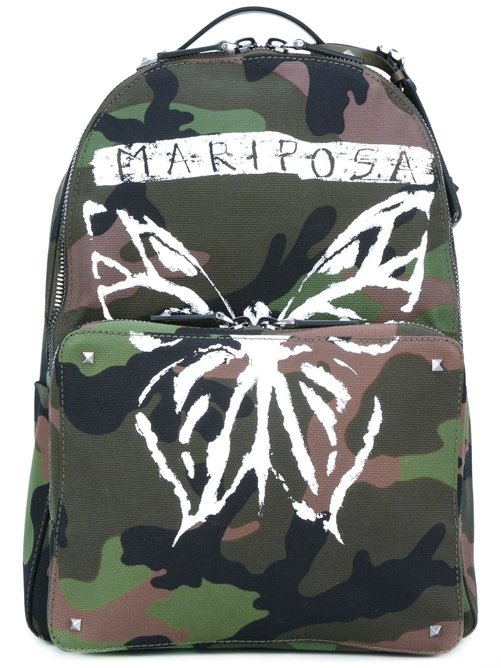 Valentino Garavani Rockstud camouflage backpack Army green cotton Valentino Garavani Rockstud camouflage backpack from Valentino featuring leather trims, a top handle, a top zip fastening, a front zip compartment, adjustable shoulder straps, Rockstud embellishments, an internal logo patch, an internal slip pocket and a Mariposa butterfly print. Made in Italy Composition Outer: Polyester 100%, Cotton 100%, Calf Leather 100% SIZE & FIT Measurement WIDTH 11.81 in(30 cm) LENGTH 15.35 in(39 cm) HANDLE 1.96 in(5 cm) DEPTH 7.48 in(19 cm) STRAP 15.35 in(39 cm)