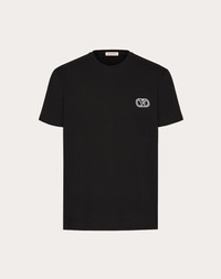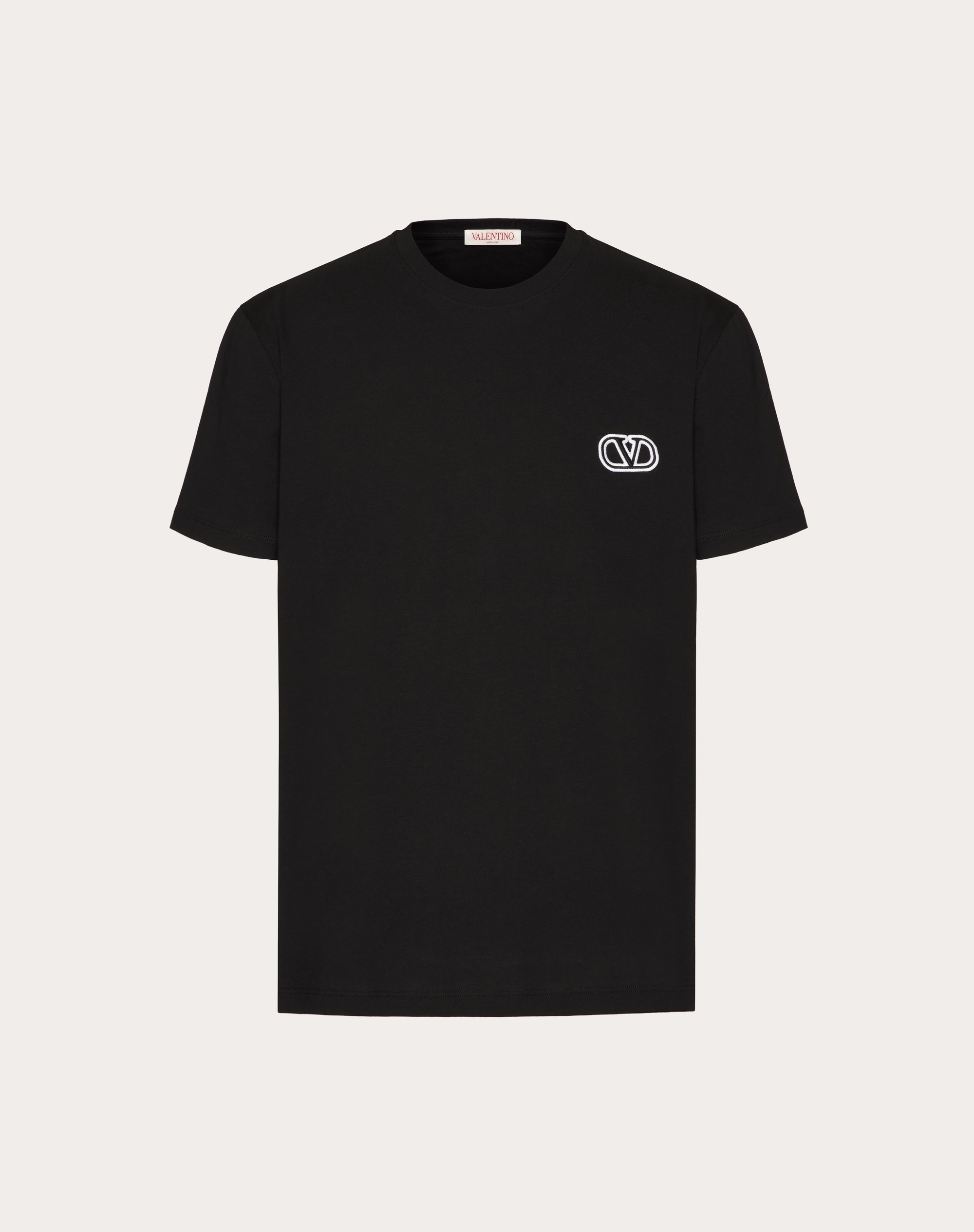 Valentino Cotton T-shirt with VLogo Signature patch - Regular fit - VLogo Signature patch on left breast as worn - Composition: 100% Cotton - Length: 72 cm / 28.3 in. from the back of the neck in size M - The model is 187 cm / 6'1" tall and wears a size M - Made in Italy The look of the model is completed by a Valentino Garavani VLOGO MOON Bag and Valentino Garavani VLogo Easyjog Shoes. Product code: 5V3MG10V9LJ_0NO