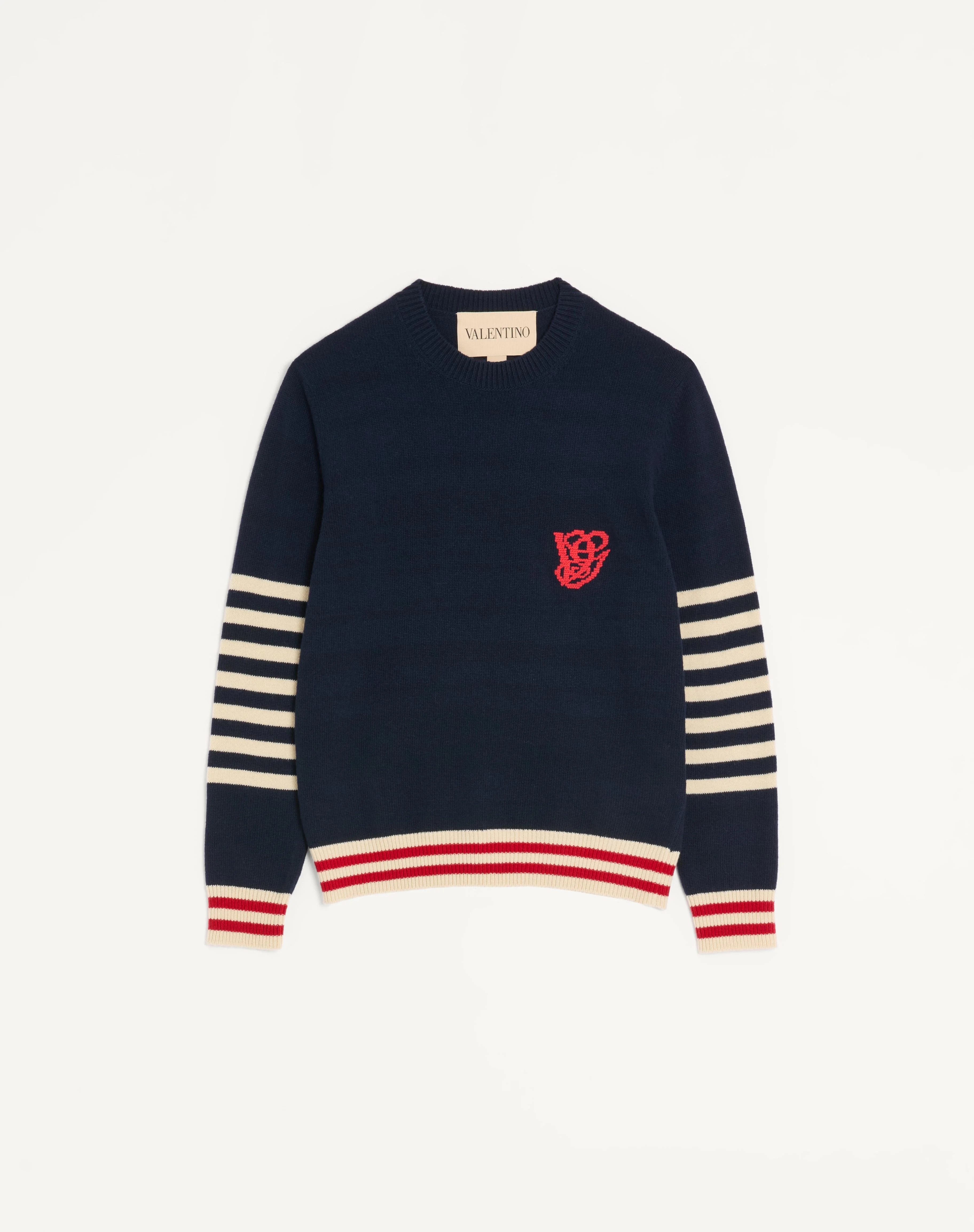 Valentino sweater with VG embroidery - Regular fit - Gauge: 7 - VG embroidery on the left breast as worn - Composition: 100% Wool - Length: 69 cm / 27.2 in. from the back of the neck in a size L - The model is 187 cm / 6'1" tall and wears a size L - Made in Italy The look of the model is completed by a Valentino Garavani Antibes Bag and Valentino Garavani VLogo Signature Shoes. Product code: 8V3KC37GBAT_BLB