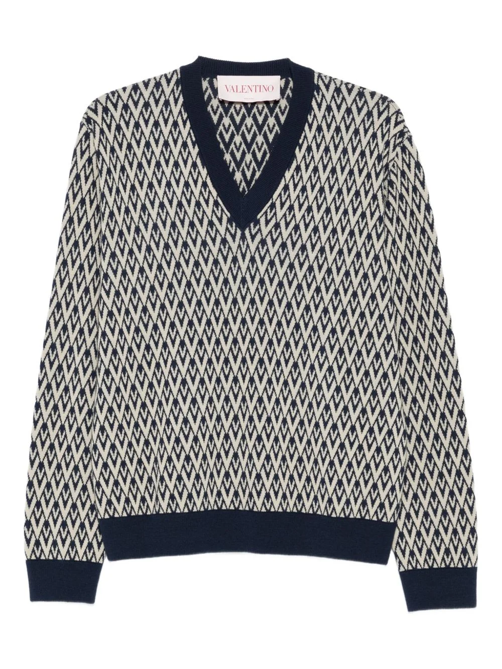 Toute La V wool sweater Highlights - Light beige/navy blue - Virgin wool - Knitted construction - Toute la v jacquard - V-neck - Long sleeves - Ribbed cuffs and hem Made in Italy Composition Virgin Wool 100% SIZE & FIT Model measurements Height 6 ft 2 in(1.89 m) Bust/Chest 34.25 in(87 cm) Hips 34.25 in(87 cm) Waist 27.95 in(71 cm)