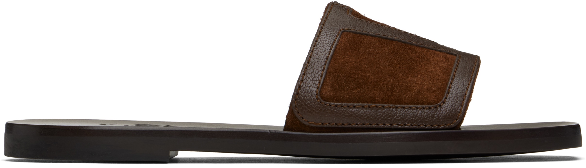 Suede slip-on flat sandals in brown. - Open square toe - Grained leather logo patch at vamp - Logo embossed at leather footbed - Rubber sole Supplier color: Bark brown