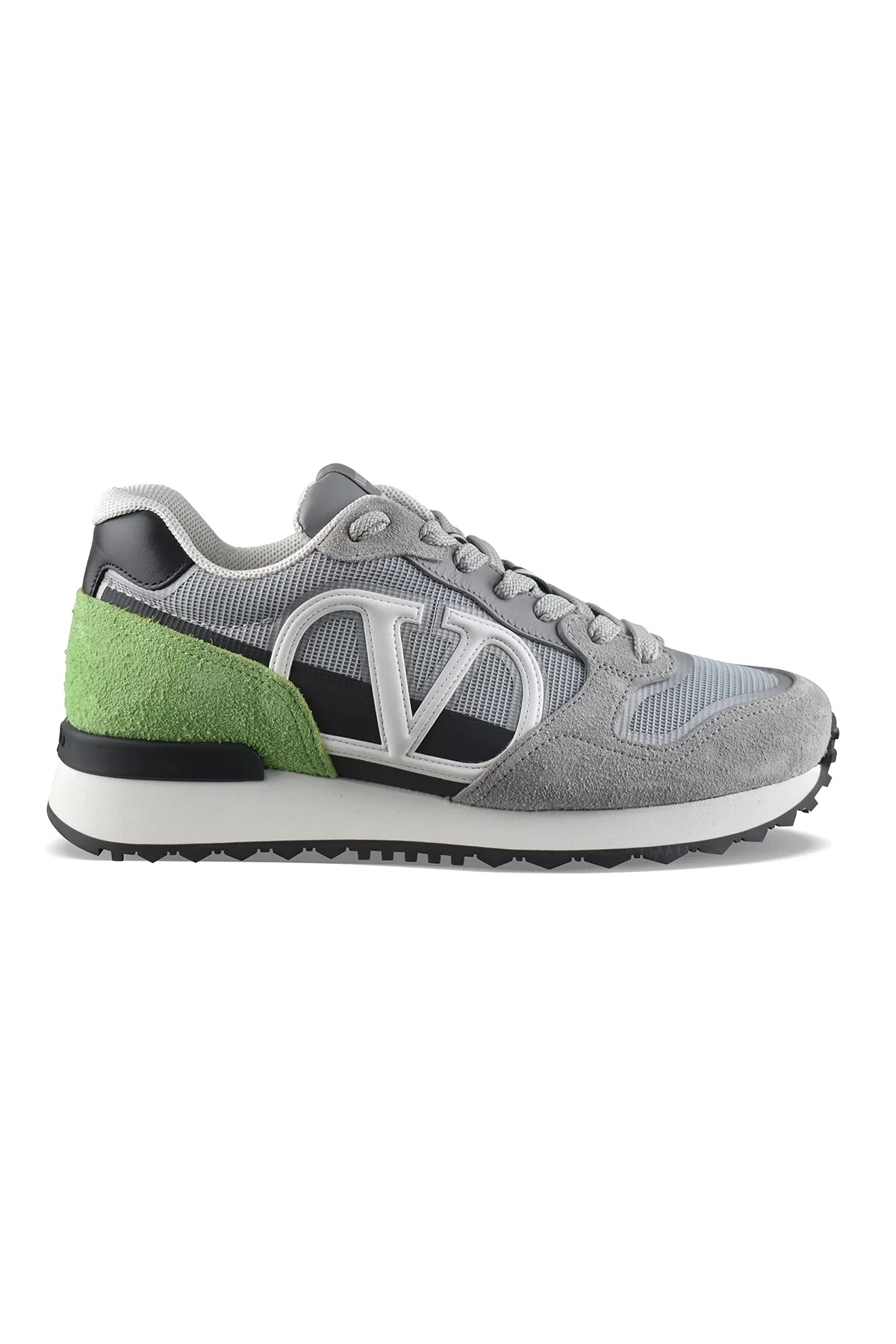Valentino Garavani VLogo Pace sneakers in grey suede. Grey fabric and black leather inserts. VLogo Signature detail in white leather. Green suede counter. Tongue with logo label. Grey laces. White rubber sole. Made in Italy.