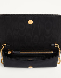 Valentino Garavani VLogo Signature velvet chain wallet with jewel logo. The accessory can be handheld or may be worn crossbody or over the shoulder thanks to the handle and the detachable chain. - Antique brass finish logo and hardware - Jewel logo adorned with synthetic pearls and Swarovski® crystals - Magnetic button closure - Leather handle - Moire lining. Interior: zippered wall pocket and two card slots - Removable chain. Shoulder strap drop length: 55 cm / 21.7 in. - Dimensions: W19xH11xD4 cm / W7.5xH4.3xD1.6 in. - Made in Italy Product code: 7W2P0AU1CPX_BBK