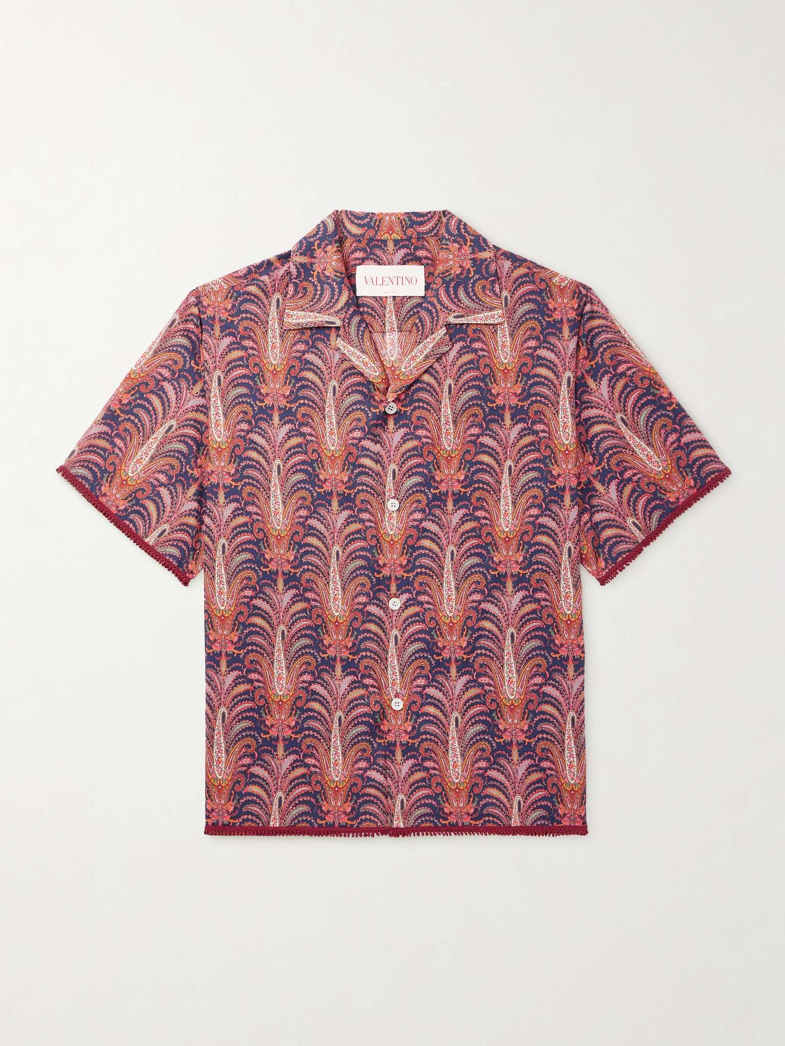 Valentino Garavani's newer collections embody an artful and dynamic energy under Alessandro Michele's creative direction. Cut from cotton-voile, this bowling shirt is printed with decadent paisley swirls and edged with burgundy trims. It taps perfectly into this season's bohemian leaning. Size & Fit - Model wears a size larger to achieve a looser fit - Lightweight, semi-sheer, non-stretchy fabric - Model is shown wearing an IT 48 - Model measures: chest 36"/ 92cm, height 6'2"/ 188cm Details & Care - Multicoloured cotton-voile - Button fastenings - 100% cotton - Dry clean - Mother-of-pearl: Vietnam
