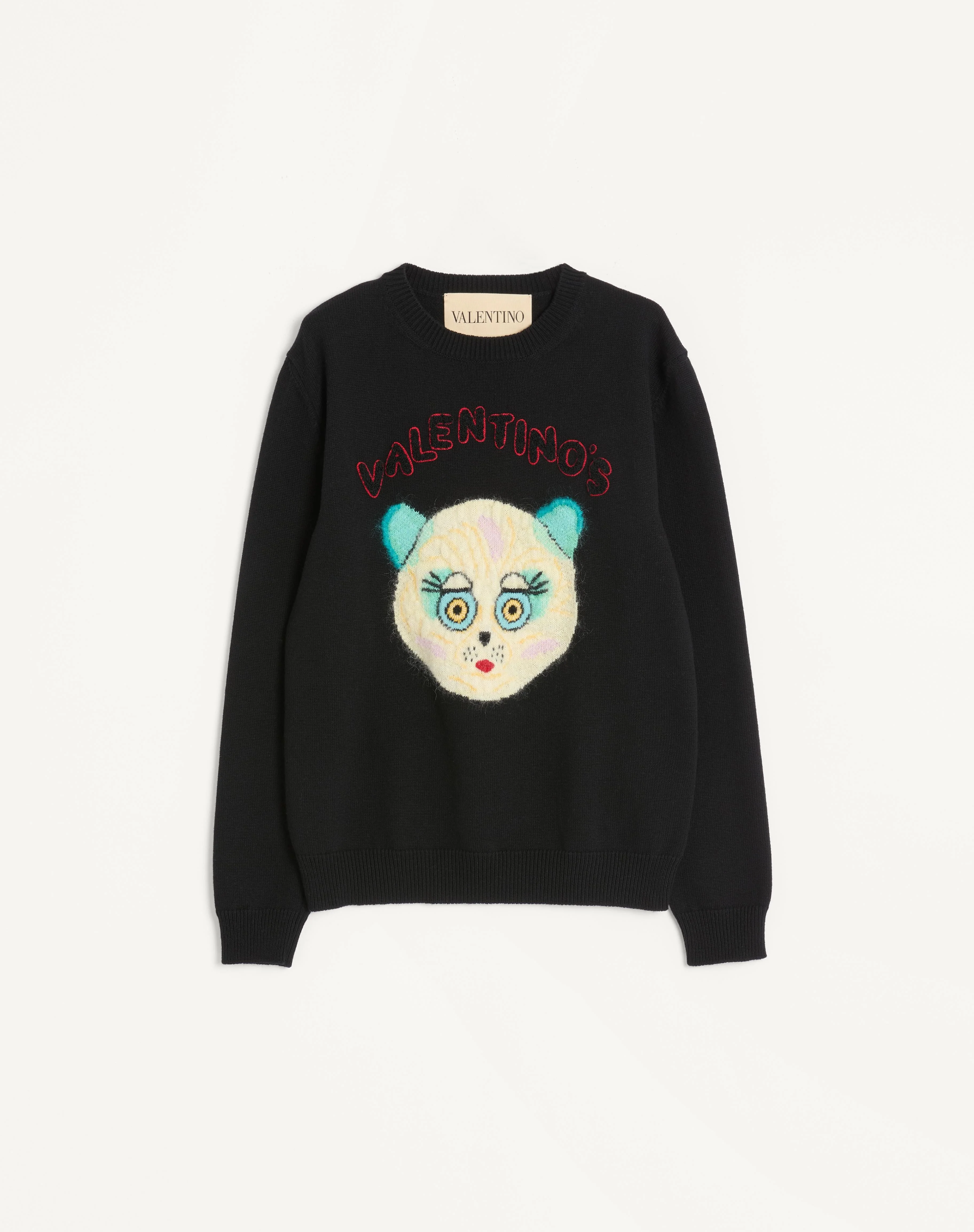 Valentino wool and cotton sweater with Le Chat De La Maison patch - Regular fit - 7-gauge knit7 - Embroidered Le Chat De La Maison patch on the chest - Composition: 65% Cotton, 35% Wool - Length: 65 cm / 25.6 in. from the back of the neck in a size M - The model is 187 cm / 6'1" tall and wears a size M - Made in Italy The look of the model is completed by Valentino Garavani Mj Blues Shoes. Product code: 7V3KC35IB2V_0NO