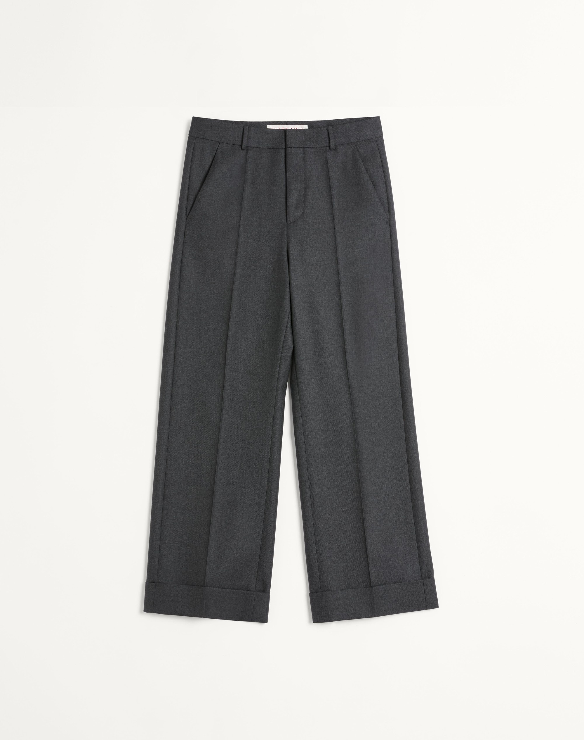 Valentino pants in wool gabardine with turn-ups - Flare fit - Two side pockets - Two rear pockets - Composition: 100% Virgin Wool - Length: 100 cm / 39.3 in. in an Italian size 46 - Leg opening: 28.5 cm / 11.2 in. in an Italian size 46 - The model is 187 cm / 6'1" tall and wears an Italian size 46 - Made in Italy The look of the model is completed by a Valentino Garavani 9TO5 Bag and Valentino Garavani Bay By Bay Shoes. Product code: 6V3RBJ70AEQ_7KC