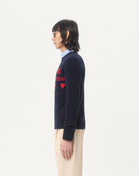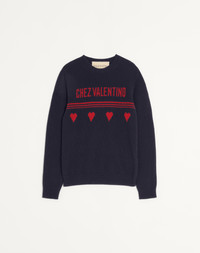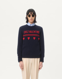 Valentino wool sweater with Chez Valentino jacquard pattern - Regular fit - Gauge: 7 - Chez Valentino jacquard pattern on the chest - Composition: 100% Wool - Length: 68 cm / 26.7 in. from the back of the neck in a size M - The model is 187 cm / 6'1" tall and wears a size M Made in Italy The look of the model is completed by Valentino Garavani Royco Shoes. Product code: 7V3KC35AB2E_AMU