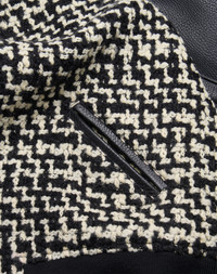 Valentino wool tweed bomber jacket with Chez Valentino patch - Regular fit - Lined - Lightly padded design - Embroidered Chez Valentino patch on the back - Leather sleeves and pocket trim - Two side flap pockets - Elasticated ribbed trim - Composition: 98% Virgin Wool, 02% Polyamide - Lining: 55% Viscose, 45% Polyester - Padding: 100% Polyester - Sleeves and details in cowhide - Length: 68.5 cm / 27.0 in. from the back of the neck in an Italian size 46 - The model is 187 cm / 6'1" tall and wears an Italian size 50 - Made in Italy The look of the model is completed by a Valentino Garavani Nellcote Bag and Valentino Garavani Pat Shoes. Product code: 6V3CIM21AMA_0AN
