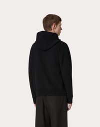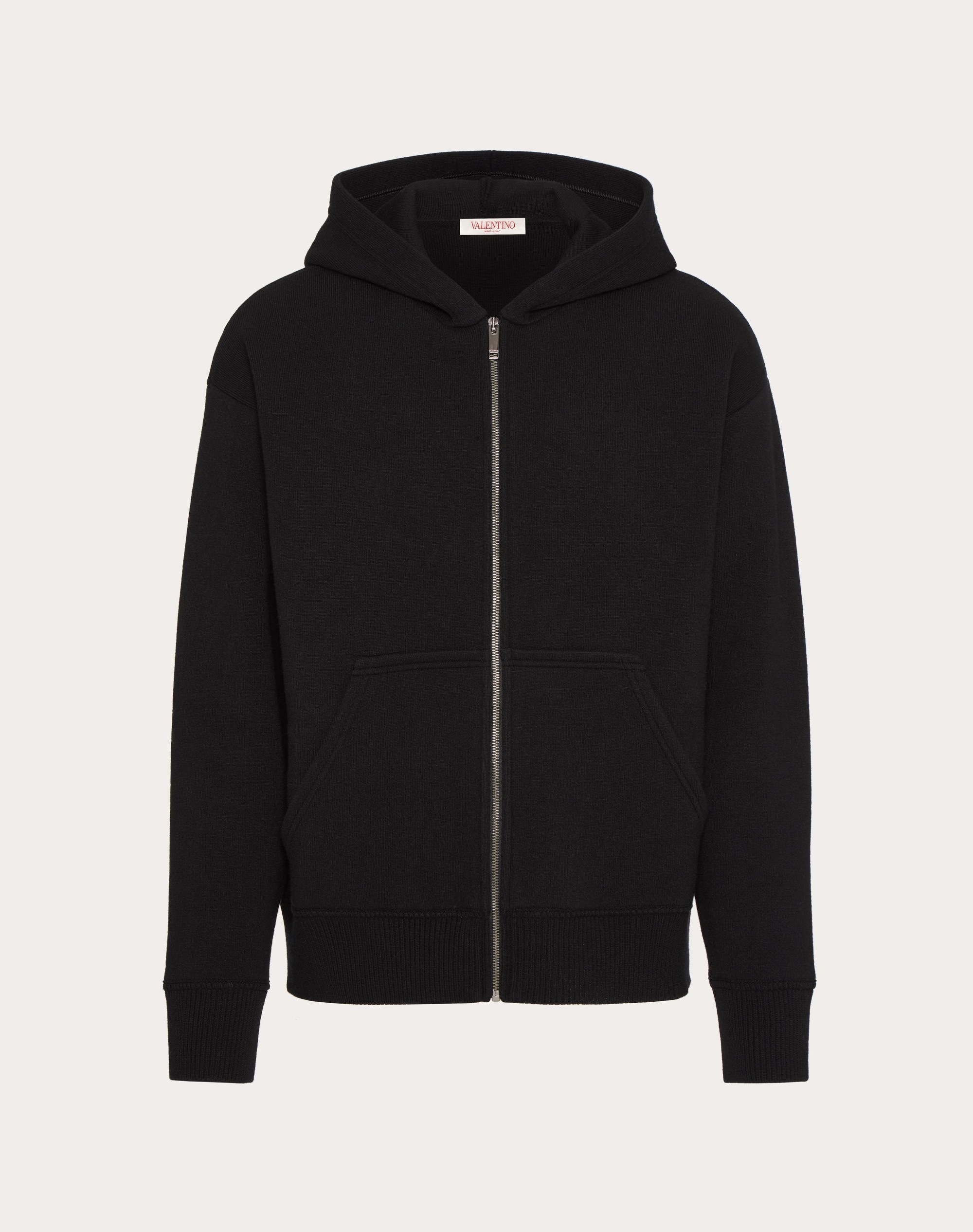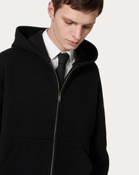 Valentino hooded wool sweatshirt - Regular fit - 12-gauge knit - Elasticated ribbed trim - Zip closure - Two side pockets - Composition: 100% Virgin Wool - Length: 68 cm / 26.8 in. from the back of the neck in a size M - The model is 187 cm / 6'1" tall and wears a size M - Made in Italy The look of the model is completed by Valentino Garavani Valentino Garavani Gentleglam Shoes. Product code: 5V0KE02MAGT_0NO