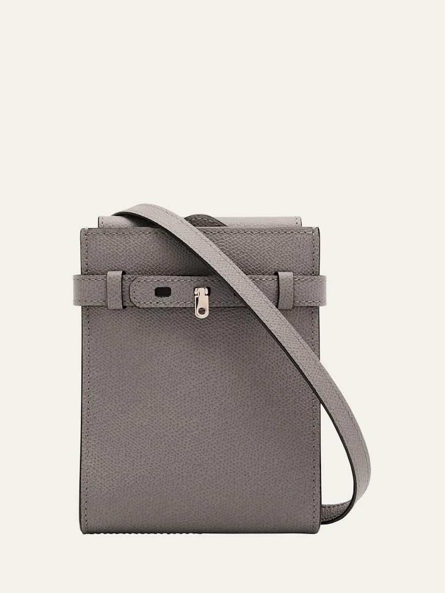 Valextra "B-Tracollina" crossbody bag crafted from signature Millepunte calfskin, showcasing a slimline design Hand-painted black lacquered Costa edging Adjustable shoulder strap Flap top Pignone clasp Discreet foiled code number is unique to the bag and the artisan who made it Approx. 6.6"H x 4.9"W x 1.5"D Made in Italy Online Inquiries: BGS21_NDPN1| Store Inquiries: #5061027
